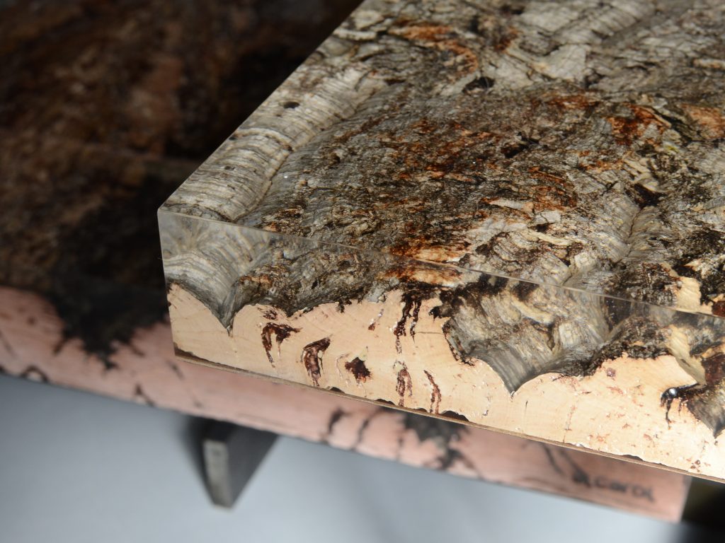 Phellem _ Low Table is made with OAK, LARCH and BIRCH BARKS and EXTRACLEAR RESIN resembling the natural conservative barrier keeping the vital wood layers away from external threats.