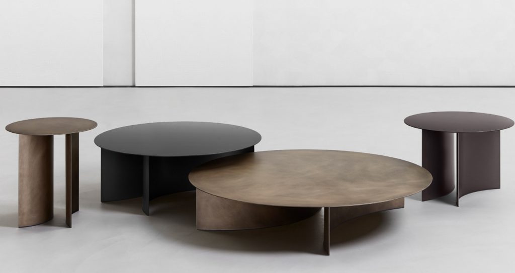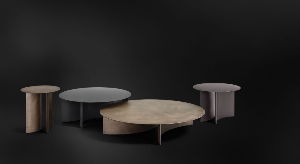 Round coffee tables in four sizes, with top and base in metal in the finishes matt burnished, oxide and black. The curved base and the variety of heights are carefully studied to allow them to lie close to each other and to the poufs of the same collection, creating compositions that are never the same.