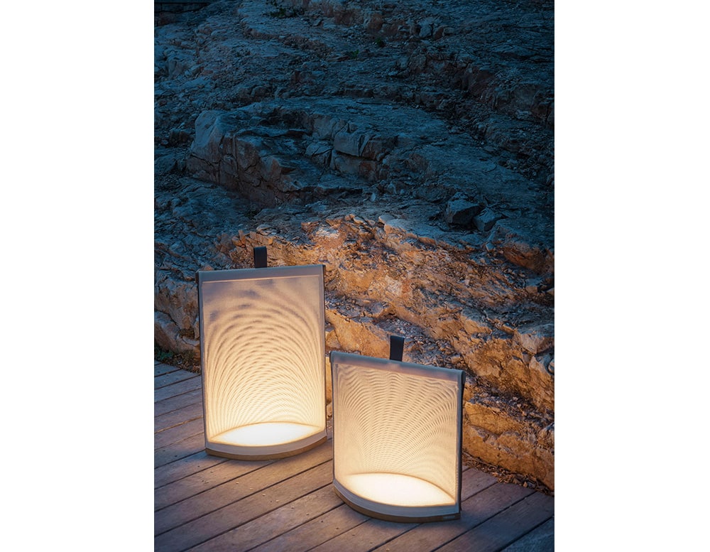 PILLOW is made of materials traditionally used by RODA, such as the natural teak for the eye-shaped base and Canatex in the sand colour for the covering, and features trimmings to define the sides of the lantern. A handle made with grey coloured belts allows the lanterns to be easily moved or hanged.