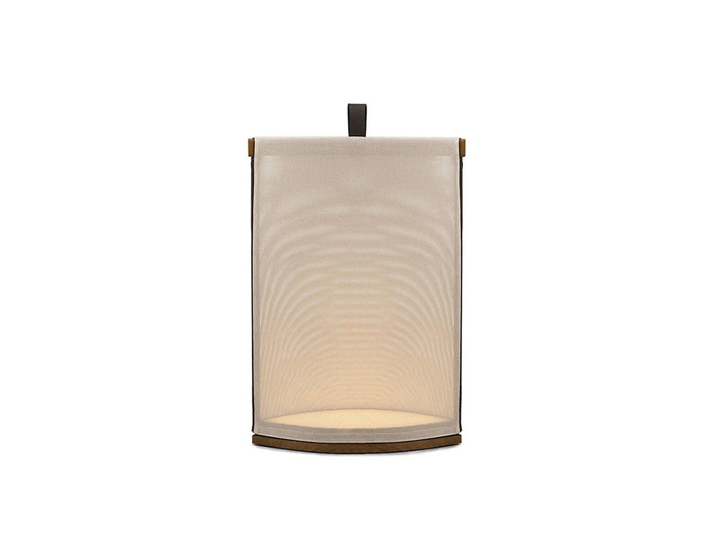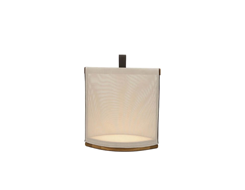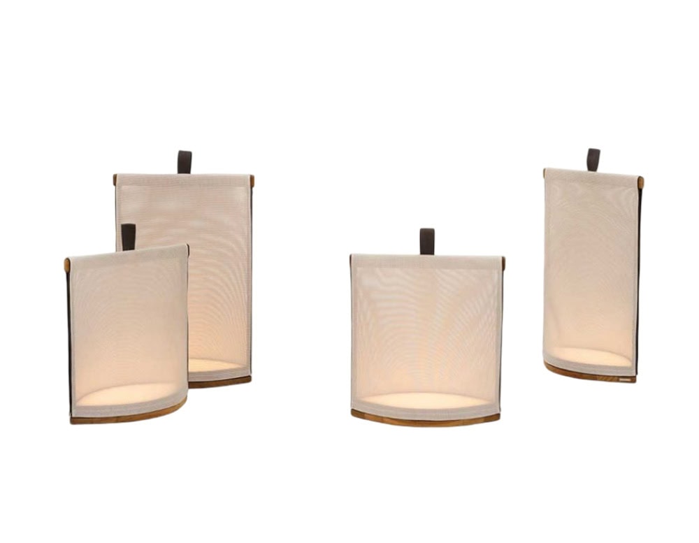 PILLOW is made of some of the materials traditionally used by RODA, such as natural teak for the eye-shaped base, Canatex in the sand colour for the covering and features trimmings that define the sides of the lantern. A handle made with grey coloured belts allows PILLOW to be easily moved or hanged.