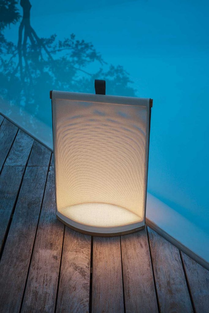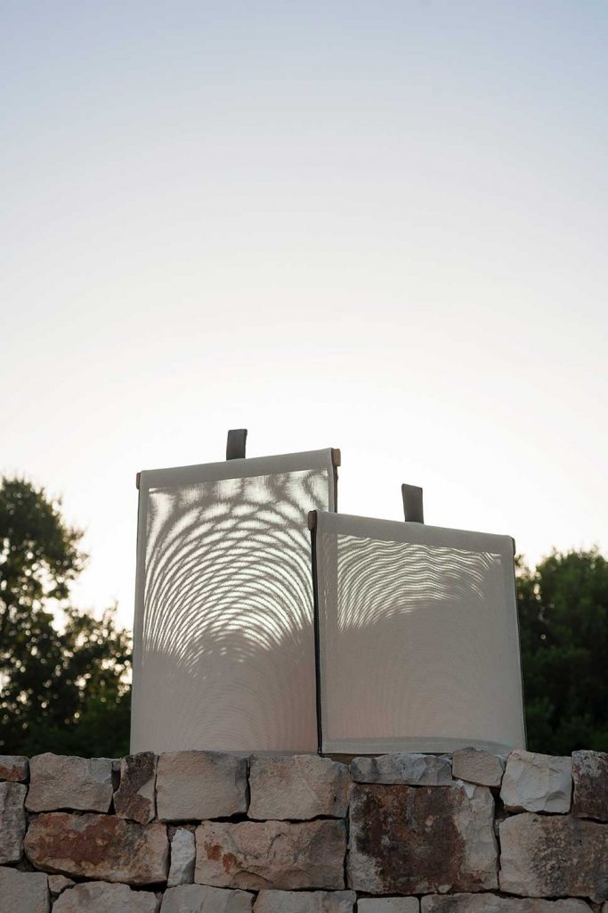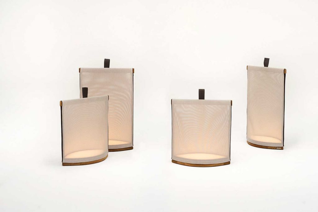 PILLOW is made of some of the materials traditionally used by RODA, such as natural teak for the eye-shaped base, Canatex in the sand colour for the covering and features trimmings that define the sides of the lantern. A handle made with grey coloured belts allows PILLOW to be easily moved or hanged.