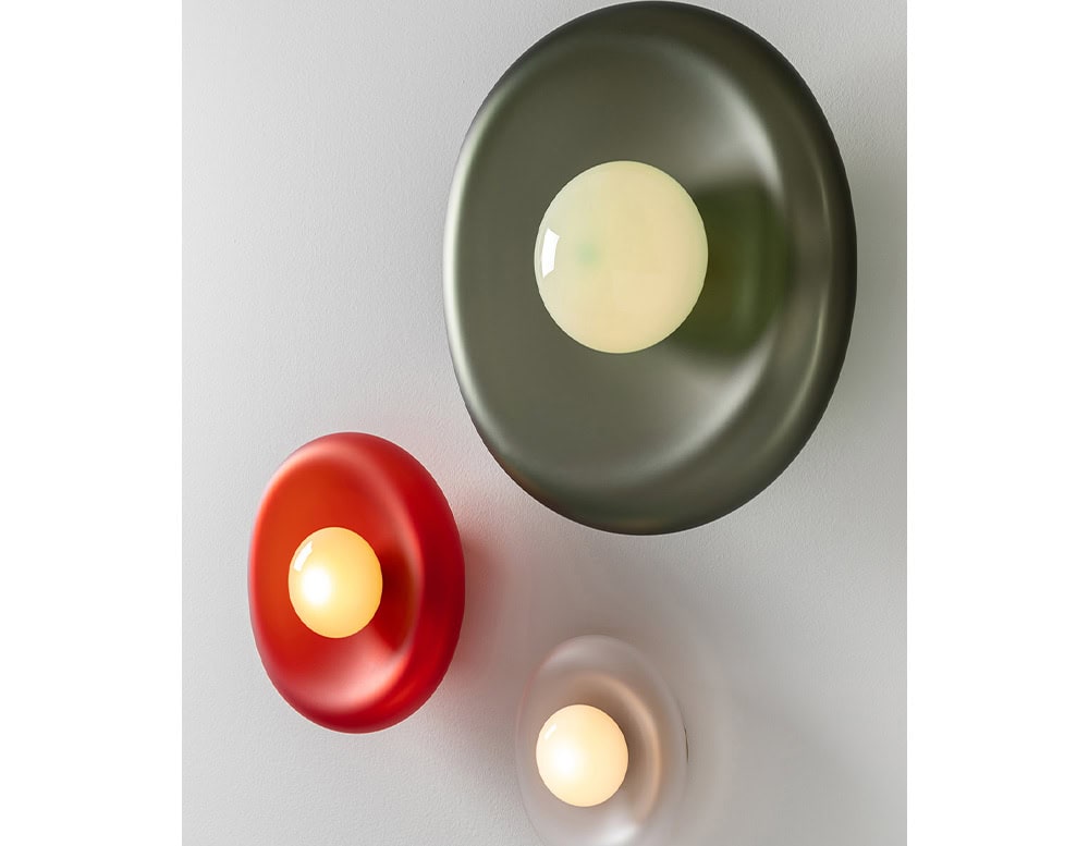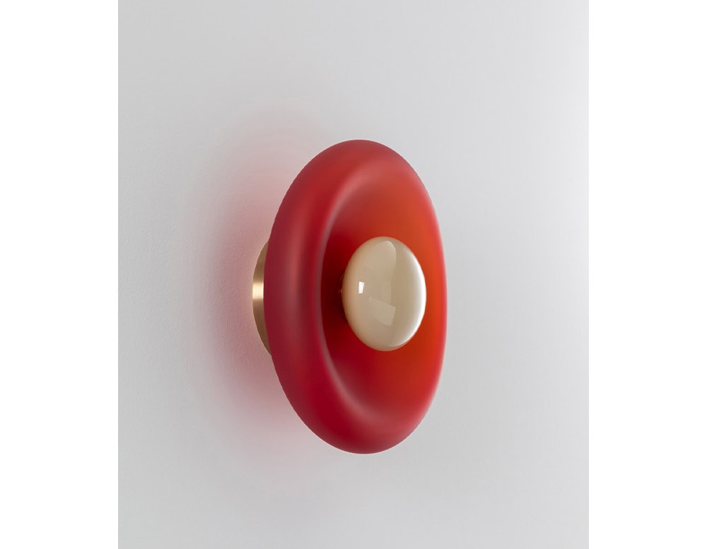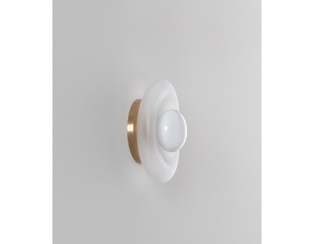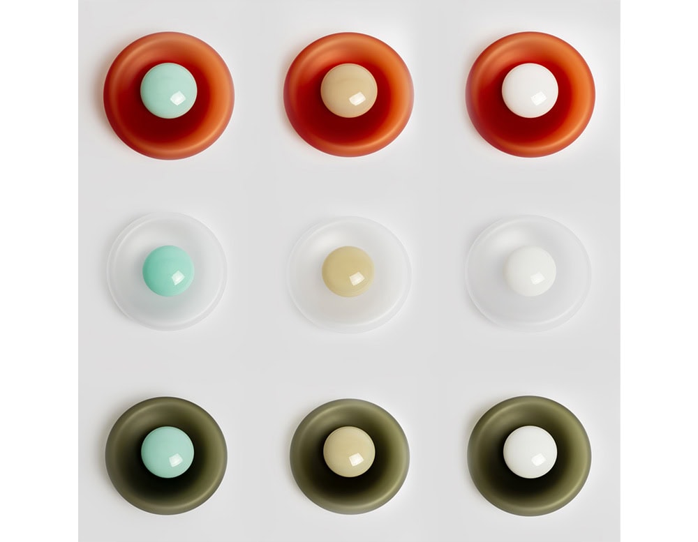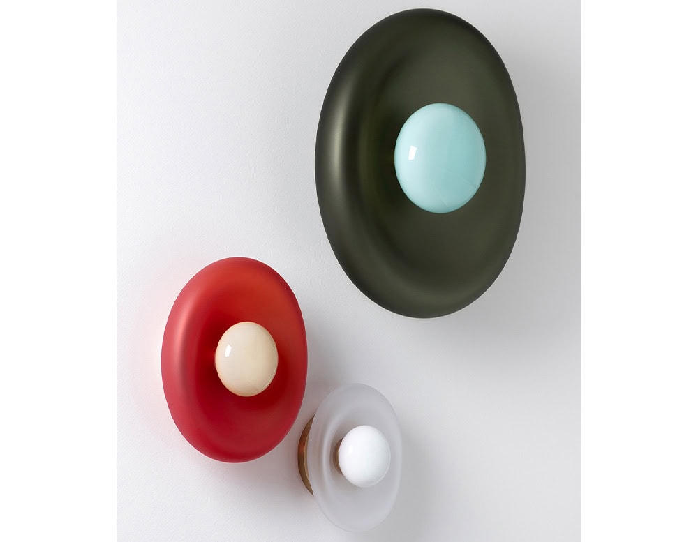 Lit spheres of glass are nestled into a curving recess in a larger frosted pillow of glass. Each of the two shapes is available in three colors, allowing for a multitude of possible combinations. The soft organic geometry of the Pillow Sconces lends an approachable whimsy; the relationship between the smooth, smaller glass shape inside the concave, frosted outer glass adds an intriguing complexity. Available in three sizes.
