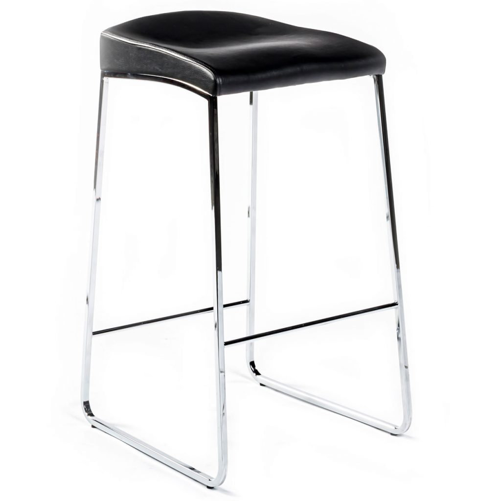 A counter stool with seat upholstered in a black leather - skay: #341. Stool features a metal chrome plated structure.