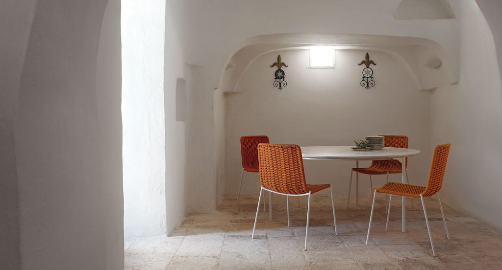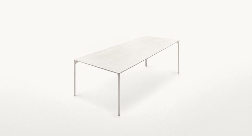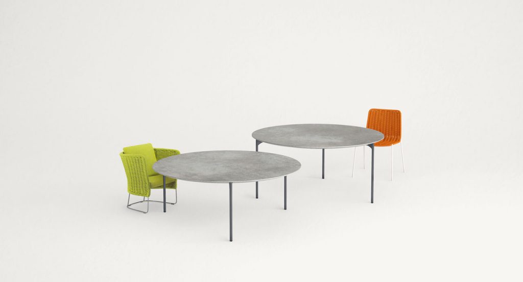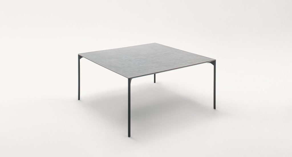Dining tables available in two heights. The series Plano also includes a side table and bookshelves. - Structure: cataphoresis treated and varnished steel in avorio, grafite or wengé colour, plastic spacers. - Tops: lightened concrete in avorio, grafite or wengé colour, matching the structure. - Notes: This product can be used also in interior environments. - The use of a Winter Set protection cover is recommended.