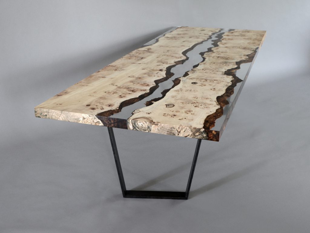 Poplar Reef _ Table is a table made of BURLED POPLAR SOLID WOOD with its natural bark surface, preserved in EXTRACLEAR RESIN resembling the water that generated their life. The legs are in BRONZED STEEL.