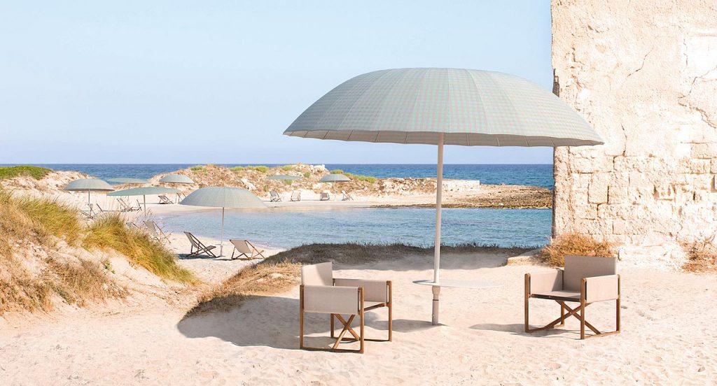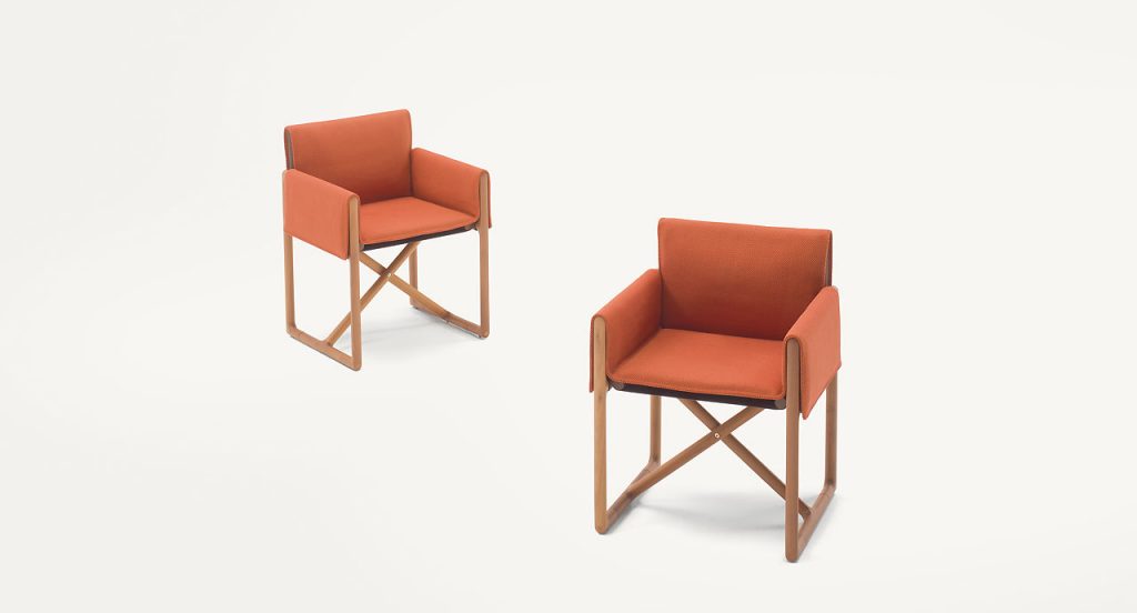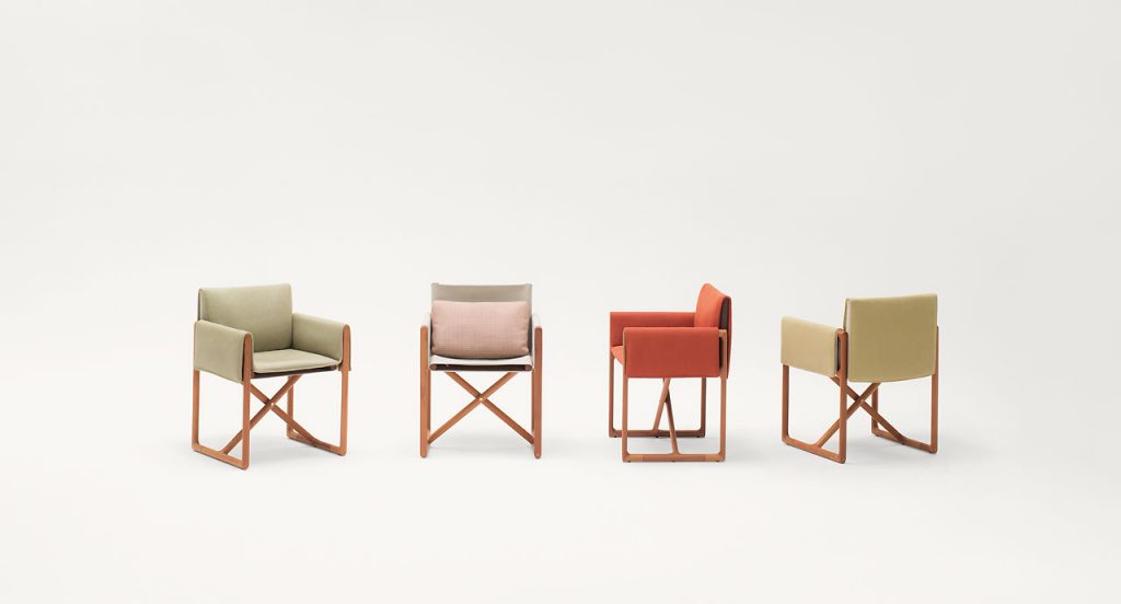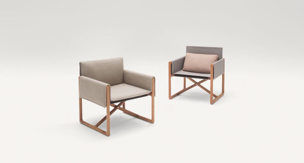 Folding chair with armrests and little armchair. The seats can be completed with a removable seat pad and a special back cushion. Portofino also includes a stool, a deck chair and a XL deck chair with folding structure, an armchair, a sofa and dining and bistrot tables with stone top. - Structure: natural or dark dyed locust heartwood treated with acrylic wax. Plastic spacers. - Folding chair code B95A is also available with structure made of gloss varnished die cast aluminium (code B95P). - Upholstery: removable cover available in the fabrics Madras or Tamil. - Seat pad: polyester fibre and polyurethane. - Seat pad upholstery: removable, in Rope T, Brio or Thea fabric. - Notes: The series Portofino includes also a tray which, positioned on the stool structure, turns the stool into a side table. - We recommend the use of a Winter Set protection cover. - Awards: The Portofino series has been awarded the GOOD DESIGN AWARDS 2016 in the Furniture category.