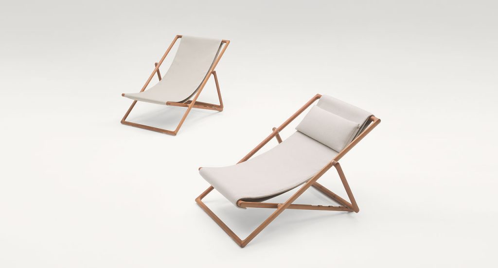 Folding deck chair and XL deck chair. The seats can be completed with a removable pad with or without headrest. Portofino also includes a chair, a little armchair and a stool with folding structure, an armchair and a sofa, dining and bistrot tables with stone top. - Structure: natural or dark dyed locust heartwood treated with acrylic wax. Plastic spacers. - Upholstery: removable cover available in the fabrics Madras or Tamil. Seat pad: polyester fibre and polyurethane. - Seat pad upholstery: removable, in the fabrics Rope T, Brio or Thea. - Notes: The series Portofino includes also a tray which, positioned on the stool structure, turns the stool into a side table. We recommend the use of a Winter Set protection cover. - Awards: The Portofino series has been awarded the GOOD DESIGN AWARDS 2016 in the Furniture category.