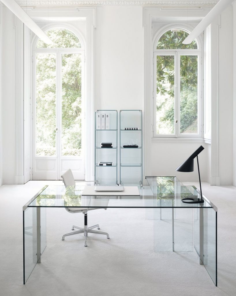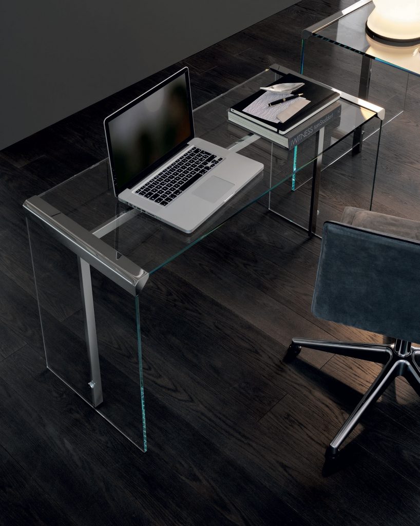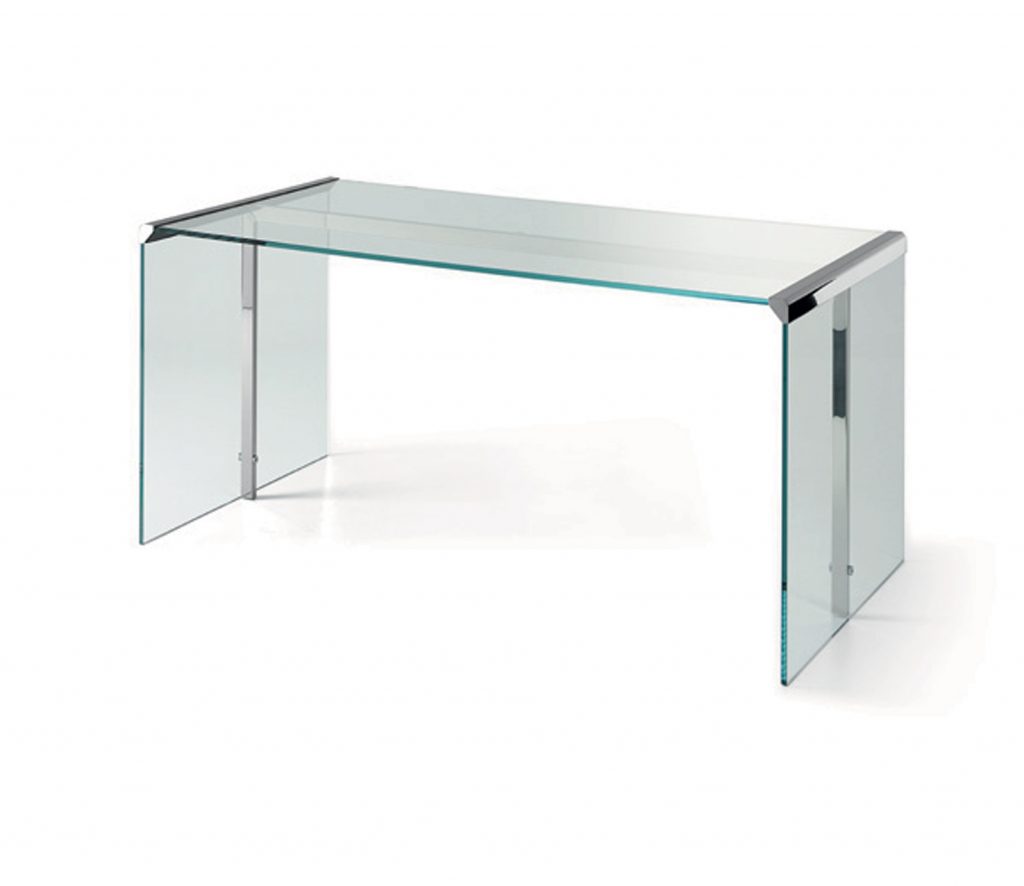 Desk and return in transparent tempered glass. Bright stainless steel metal parts. Satin stainless steel, bright or satin brass or embossed white or black lacquered metal parts, on request. For a proper cable management, a hole on the top can be arranged upon request. Minimum distance from the edge: 10cm.