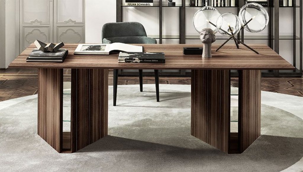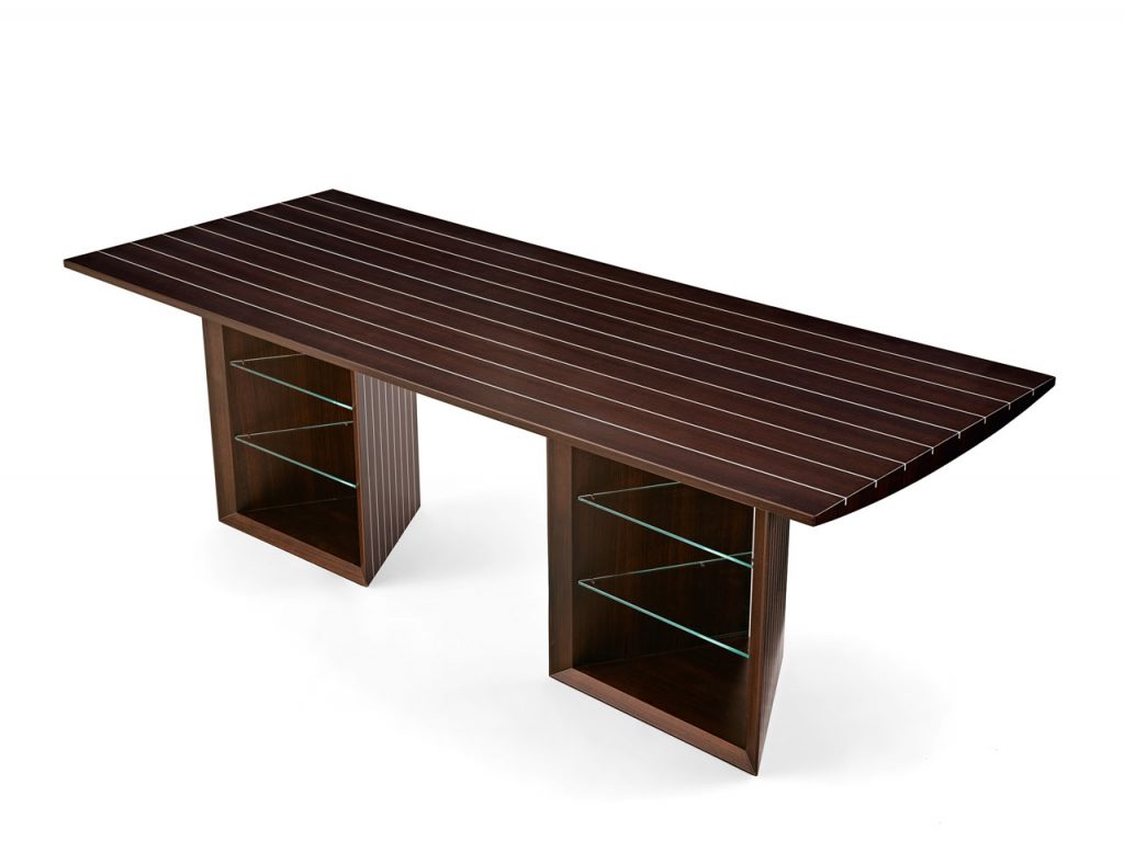 Desk in India Rosewood laid in line with natural aluminium. Bases provided with two 8 mm thick extralight tempered internal shelves.