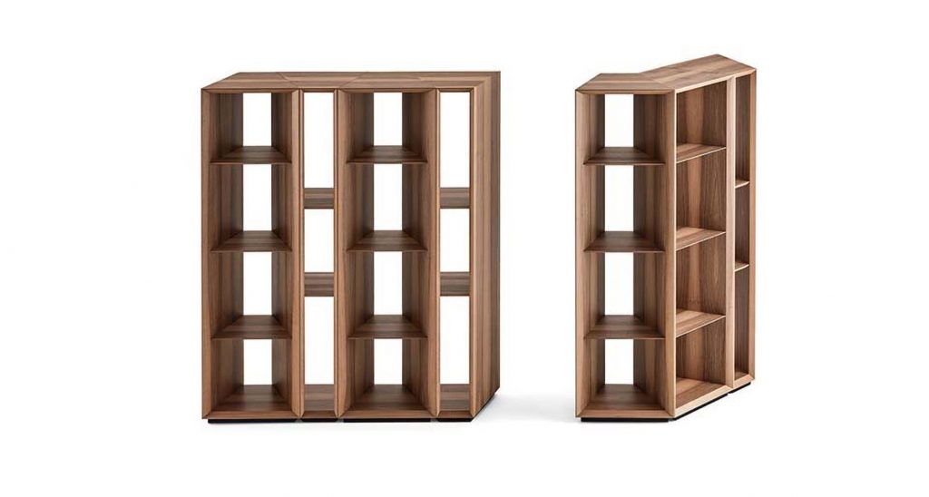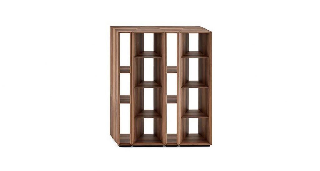 Modular high level bookcase in "Colore" Frisè Walnut. Satin brass metal parts. Available with two or three shelves. Placing together two or more modules allow to create various compositions.