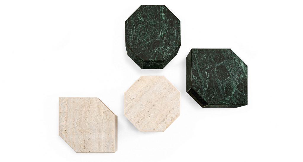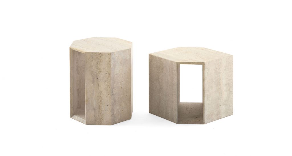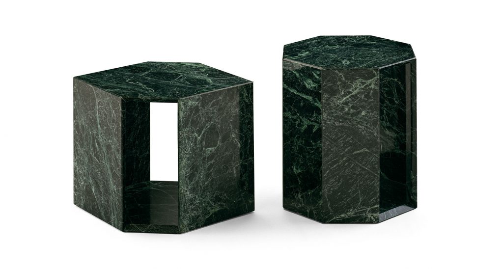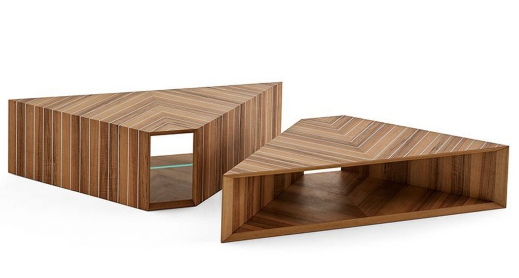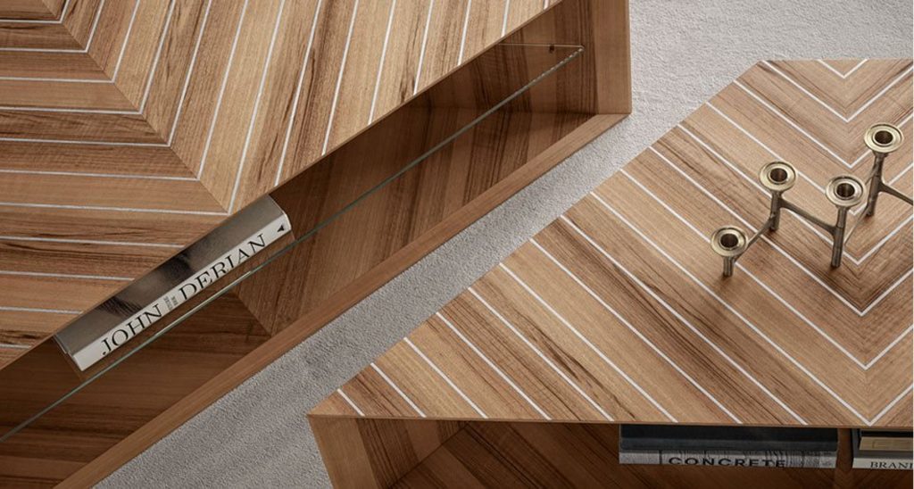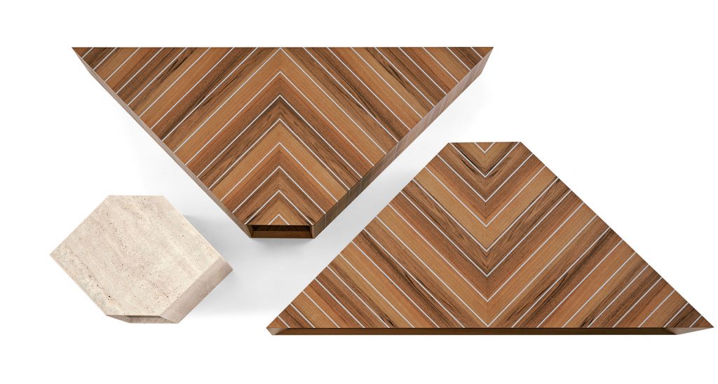 Coffee table in "Colore" Frisé Walnut laid in line with natural aluminium or India Rosewood laid in line with natural aluminium. 37 cm h. version supplied with 8 mm thick extralight tempered inside shelf. 40/47 cm h. version available in eithernatural brushed Travertino Romano (not treated with resin) or natural polish Verde Alpi marble.