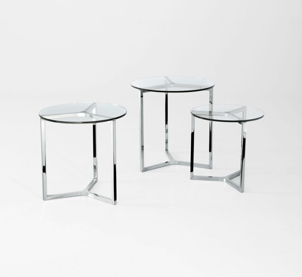 Coffee table with 8mm transparent glass top. Painted glass as per samples in the bright or satin version on request. Bright stainless steel base (20x20x1,5mm). Chromed aluminium central part.