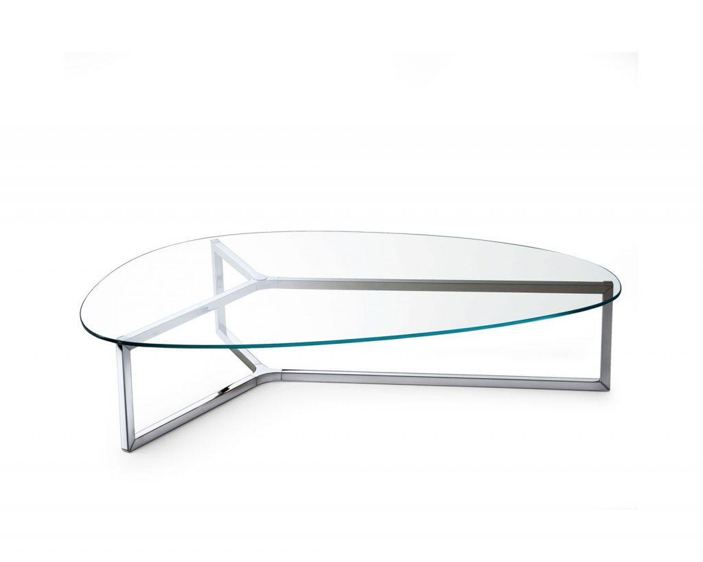 Raj 3: Oval glass coffee table with a silver metal base on a white background.
