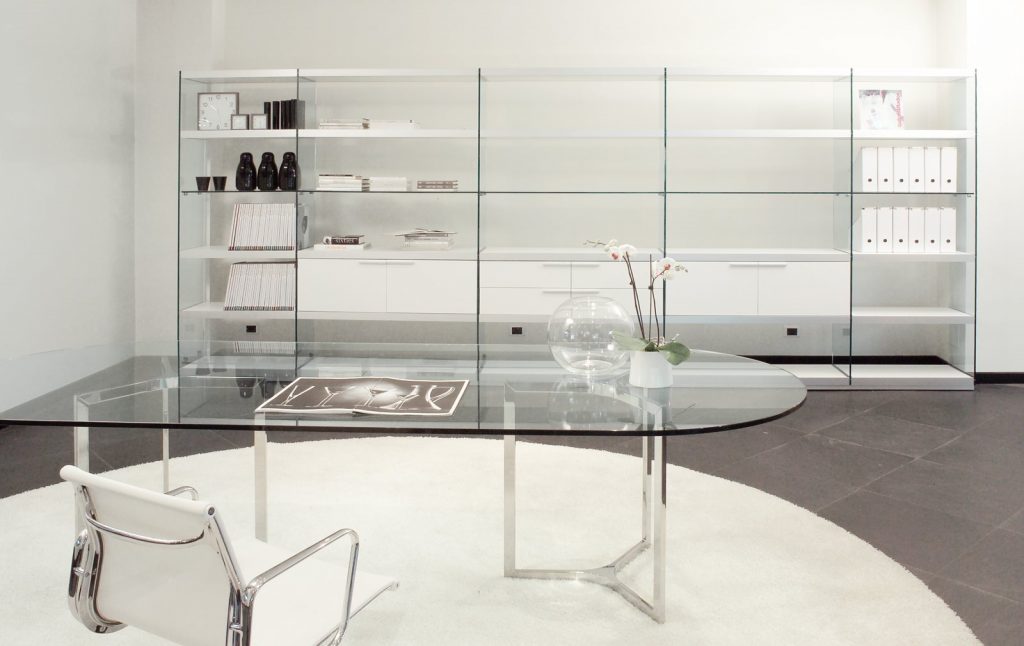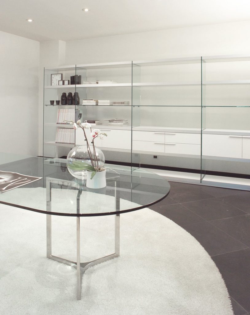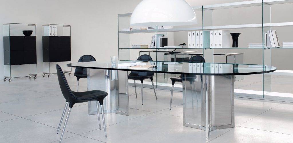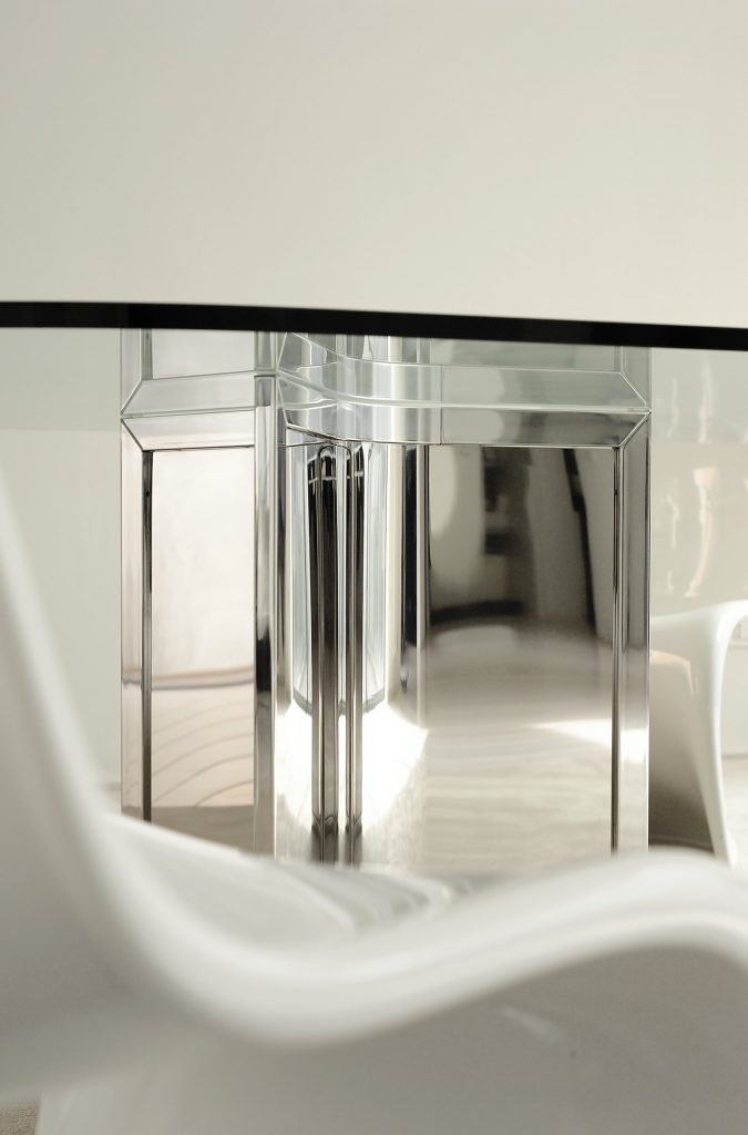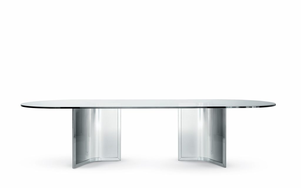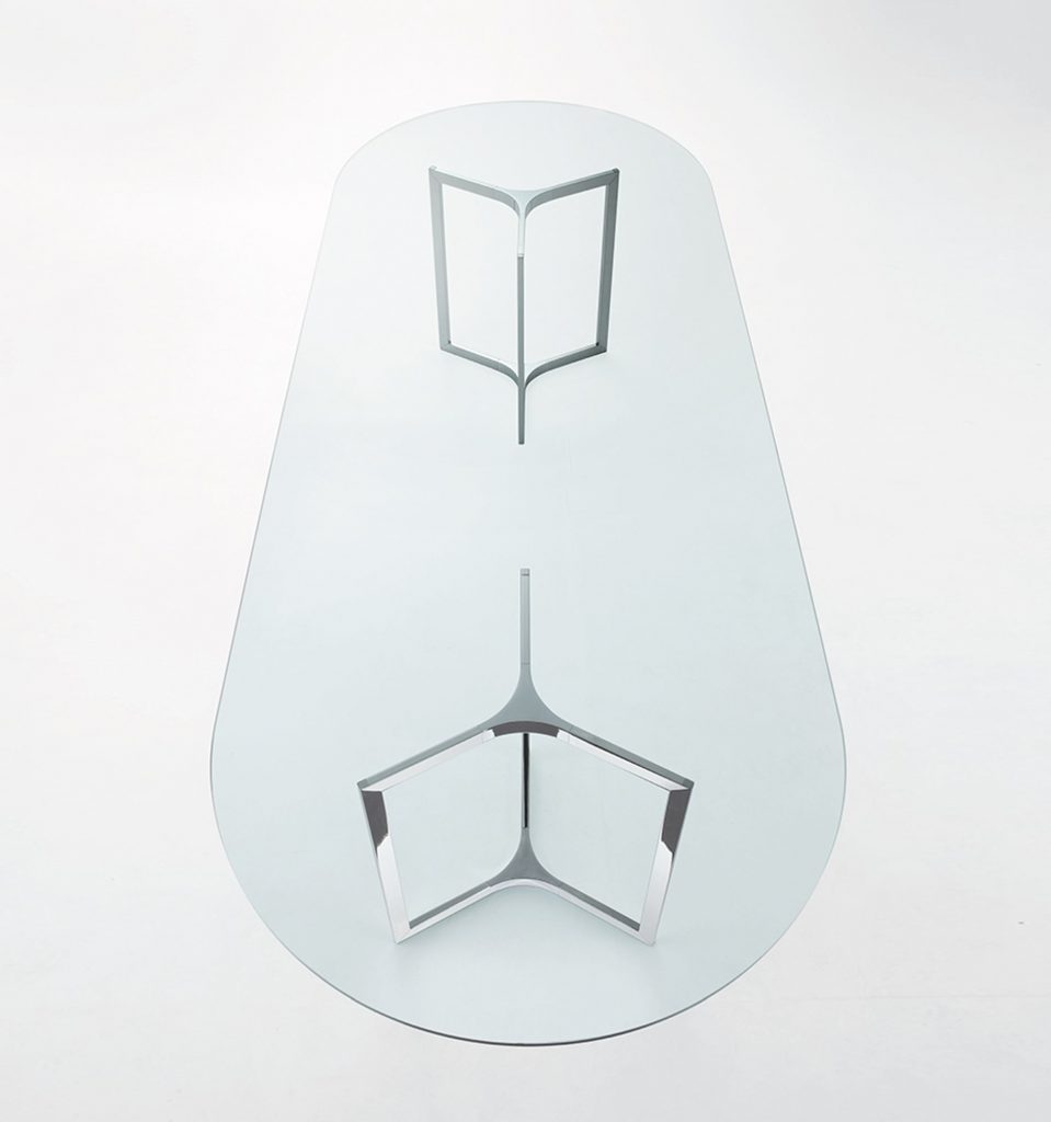 Raj - Table with transparent glass top. Bright stainless steel base with bright steel insert. Chromed aluminium central joint. Raj Light - Table with transparent glass top. Bright stainless steel base. Chromed aluminium central joint.