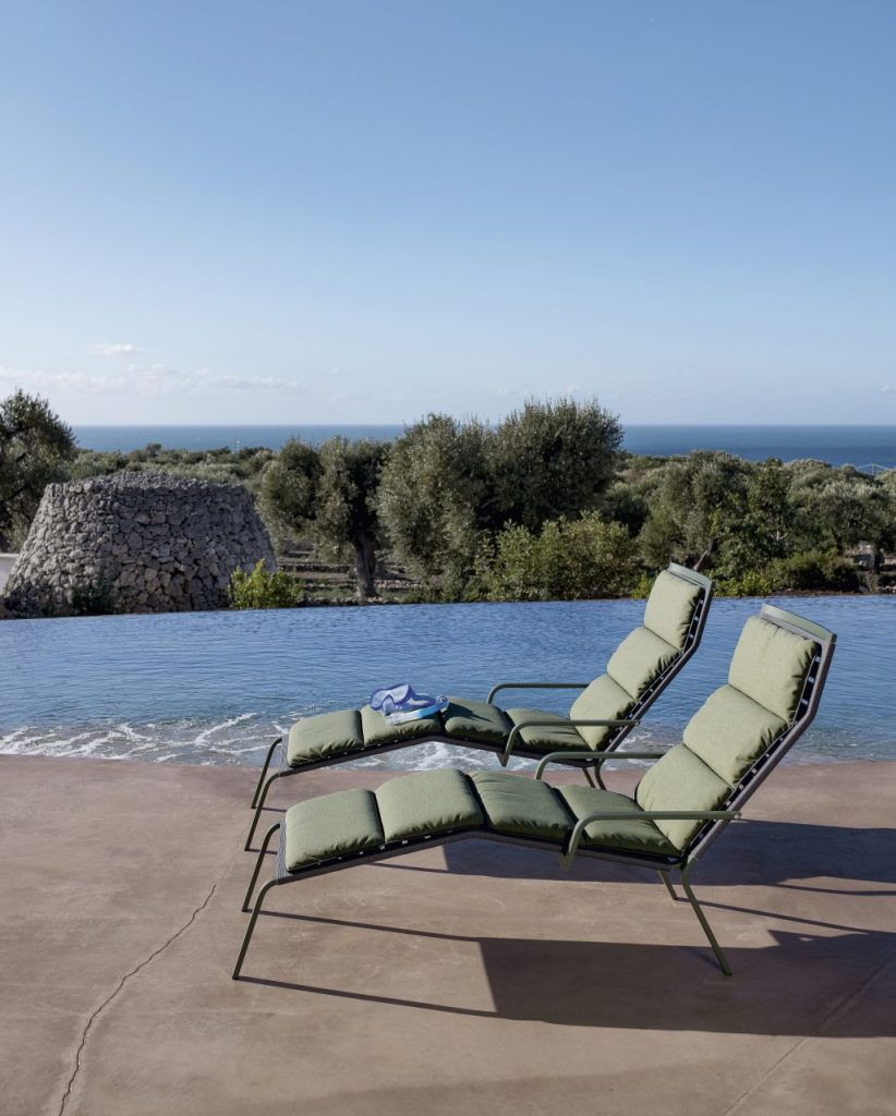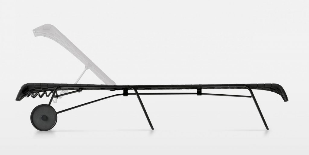An entire collection developed together with two outdoor design specialists: Harry&Camila. It includes a stackable chair and lounge chair with or without armrests, a stackable chaise lounge and a lounger on wheels. They have powder-coated aluminium frames suitable for outdoor use, whereas upholstery is made of polyester rope or interlaced straps. The items in the Rest collection can be made even more comfortable and attractive by adding Lips removable padding, available in a variety of colour combinations.