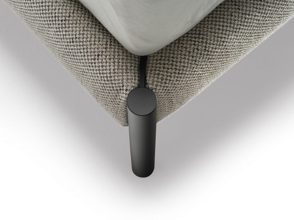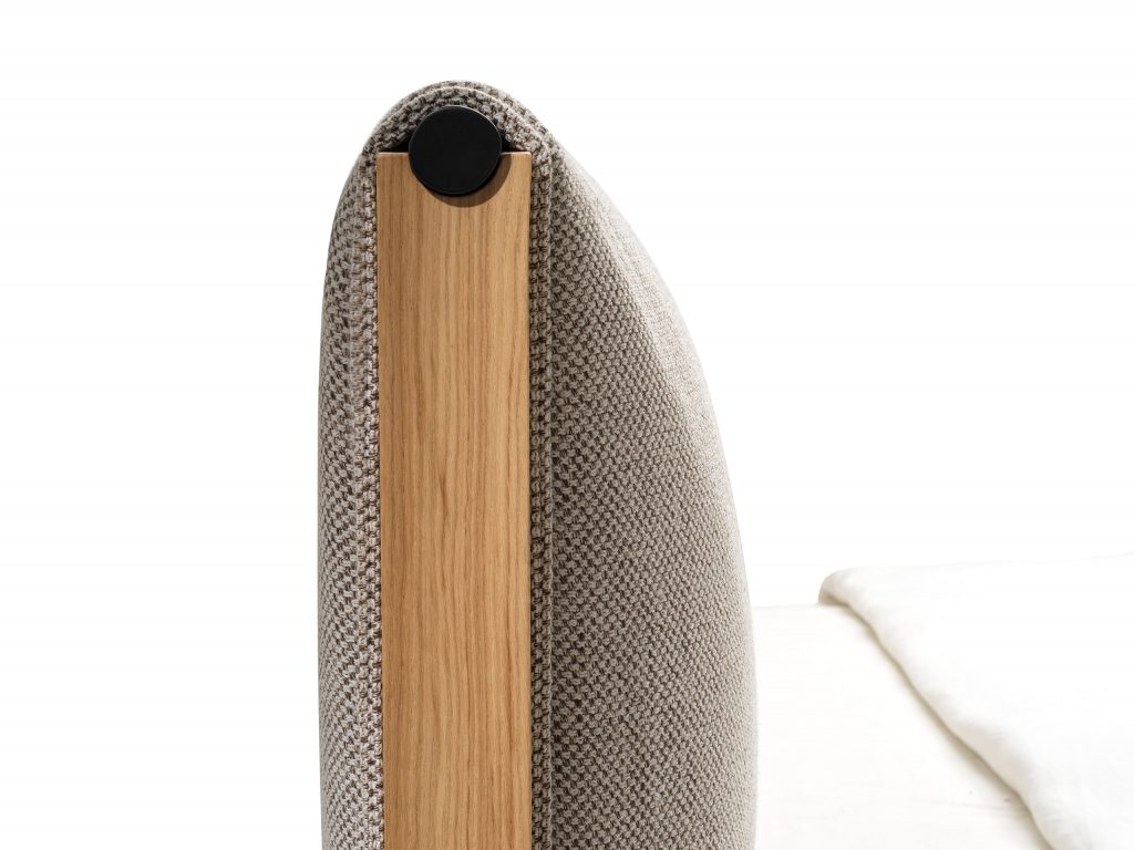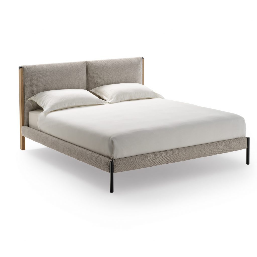 Bed with single or separate springing. Headboard frame in natural or in open pore painted oak. Upholstery in polyurethane/heat-bound polyester fibre. Front feet and headboard upper rod in matt black varnished steel. Removable fabric or leather cover. Steel base with natural bent beech strips (6,8 cm wide). Upon request the bed size for 210 cm long mattress is available as well as the springing with strips 3,8 cm. wide.