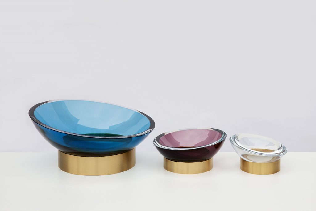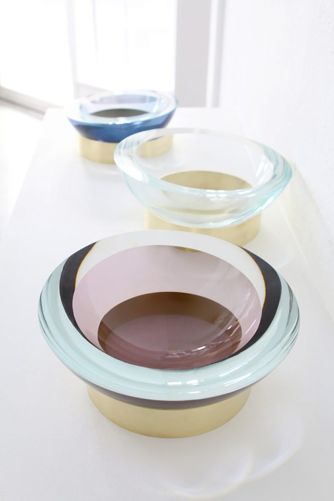 is shaped by hand while hot on the glass blower's pipe, and it is extra thick and massive as a result. This allows for the lip of the glass bowl to be cut and highly polished. The sturdy ring is custom made from solid brass to fit the bowl, elevating it.