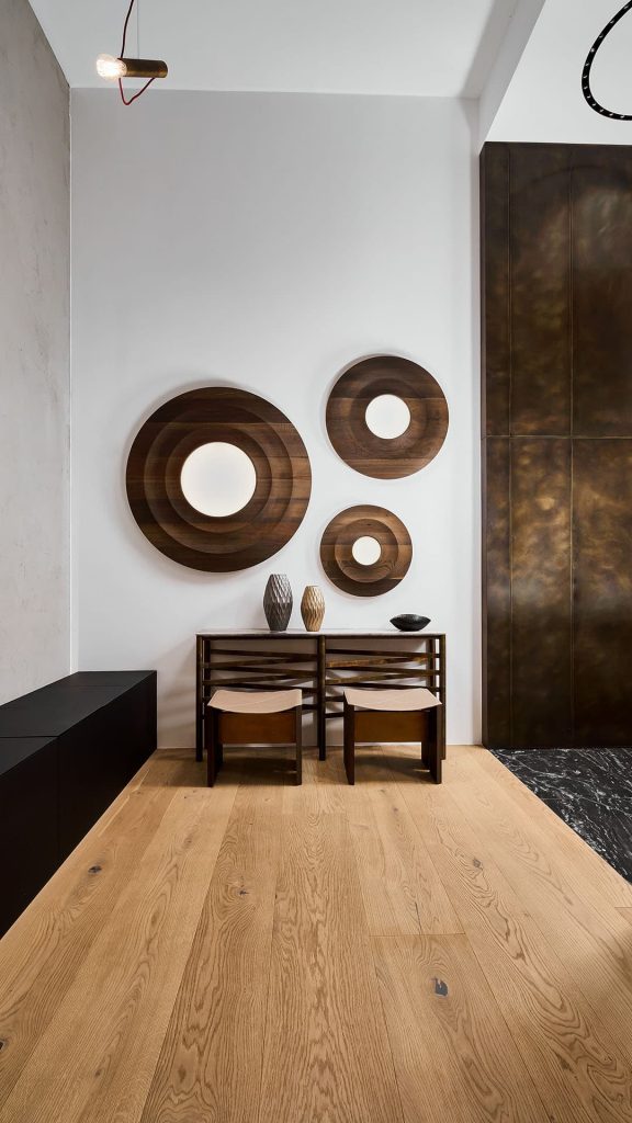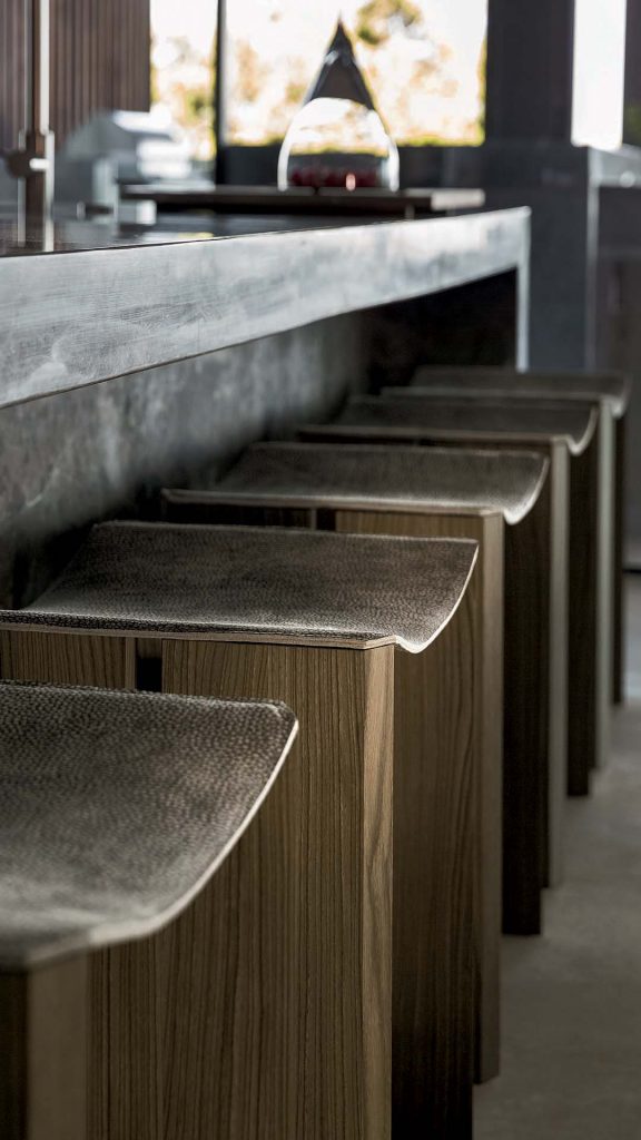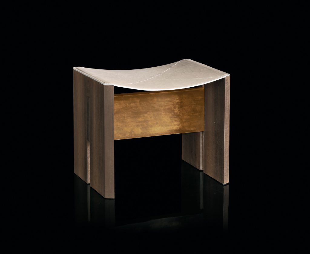 Structure solidwood, thickness 3,6 cm, with central crosspiece covered in brass hand-burnished using traditional techniques; seat in durango leather with finishes from the samples available - finish heat treated woods as our samples and swamp oak oil finish based on natural wax and water.