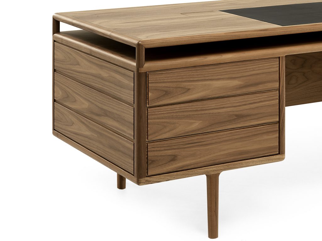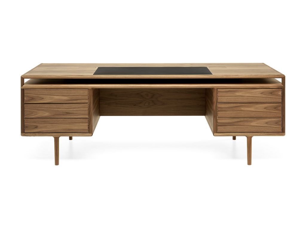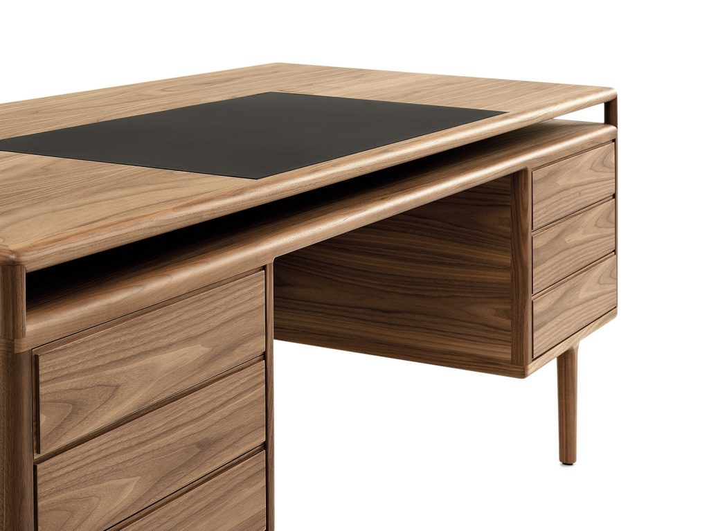 Writing desk made in solid american walnut and plywood veneered american walnut, 6 drawers, top with leather pad, electrical cable passage with wooden flip-up panel.