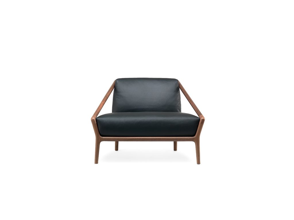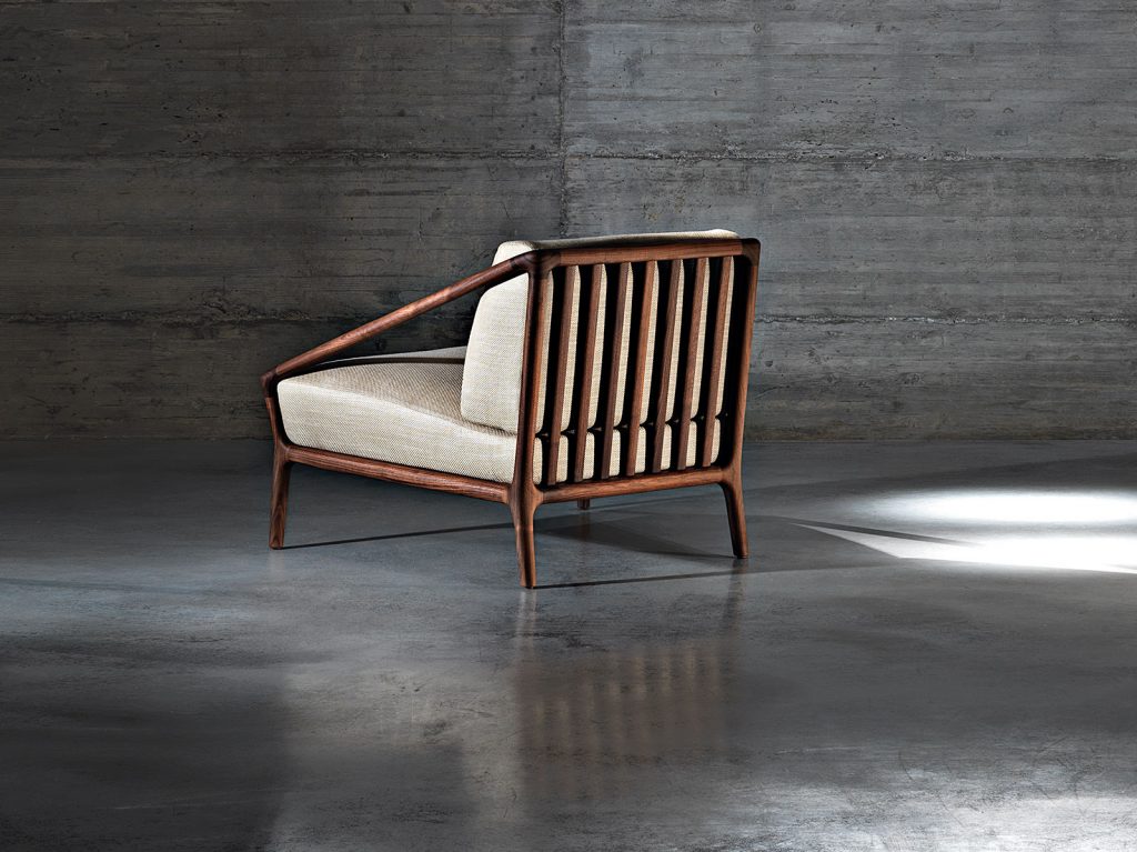 Armchair with structure made in solid American walnut, seat cushion with plywood frame covered in polyurethane foam of various densities. Back cushion with down filling.