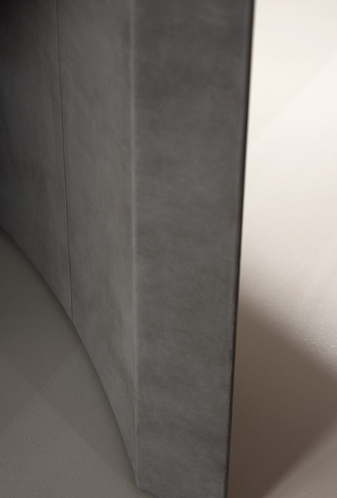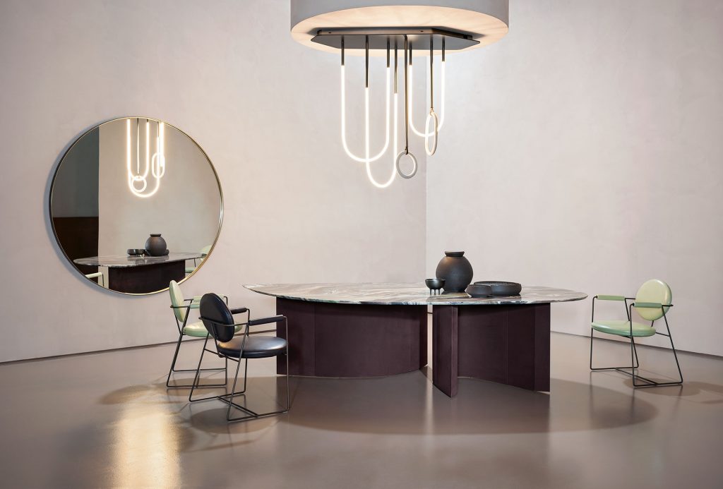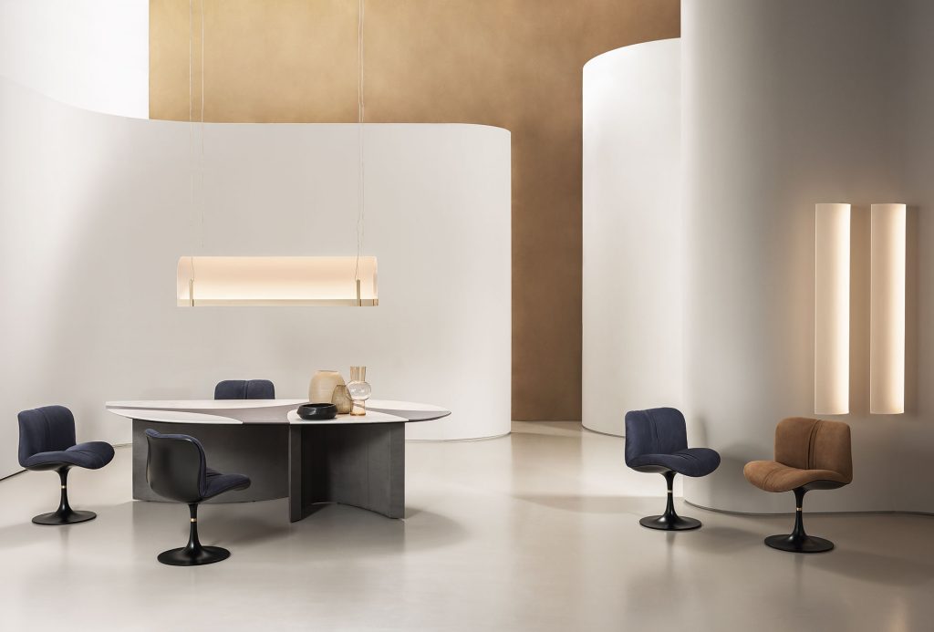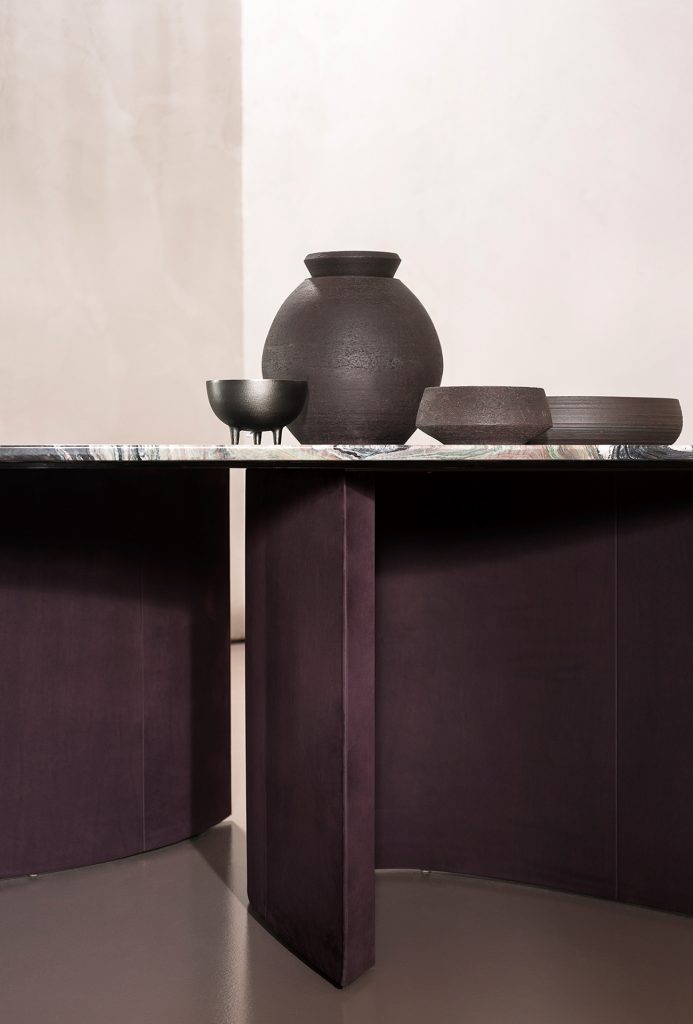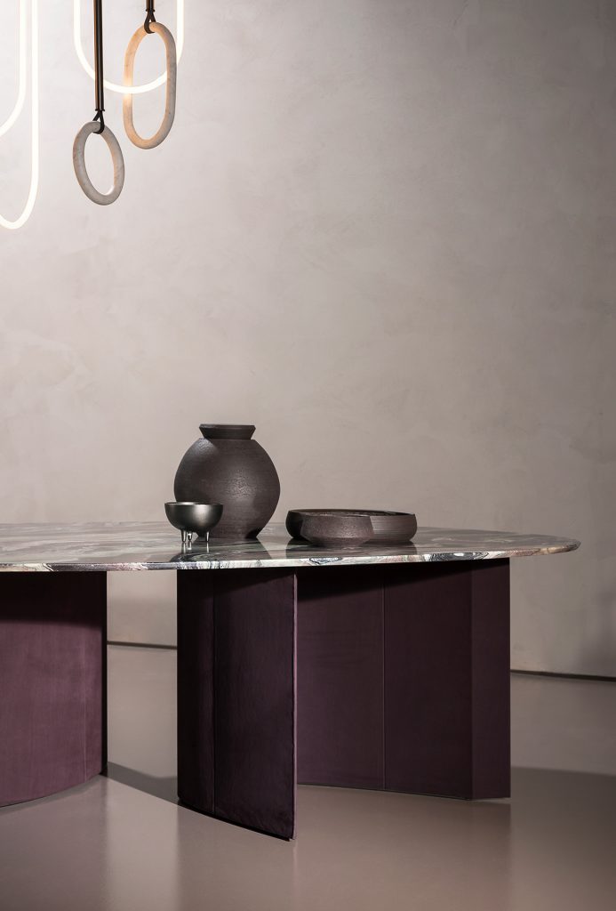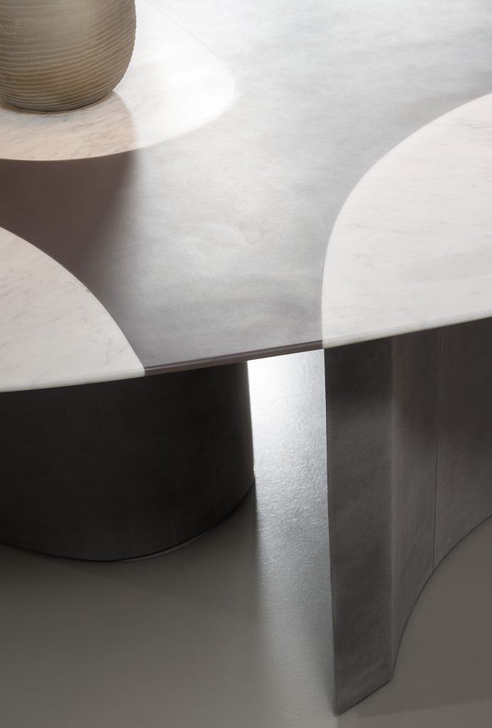 Drop-shaped table made of marble in a varied color tone in an office with a stone base in a brown tone
