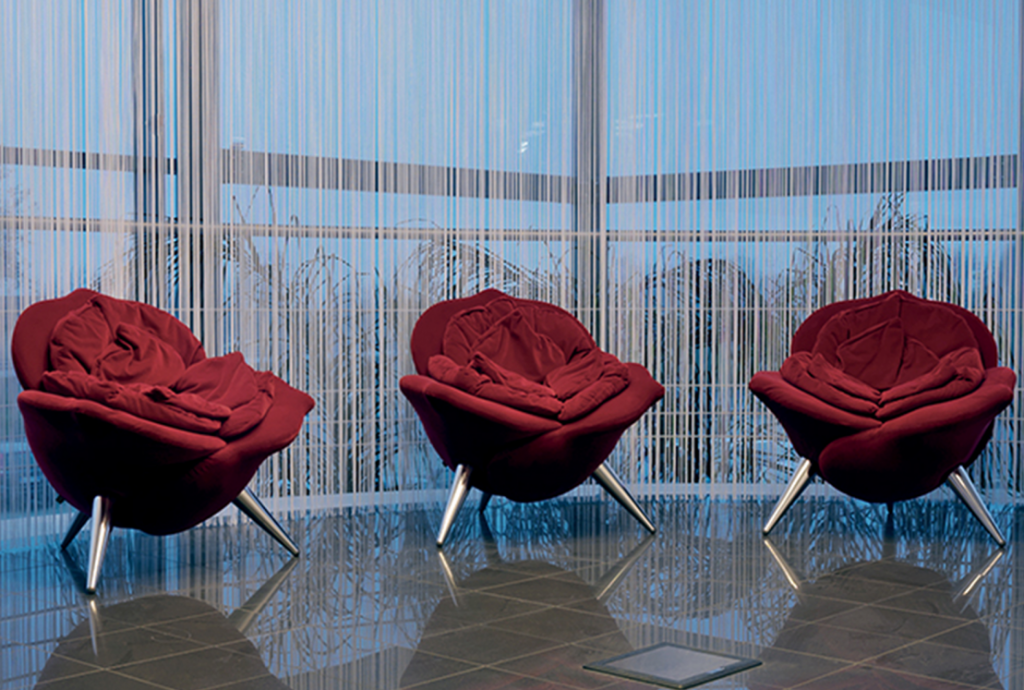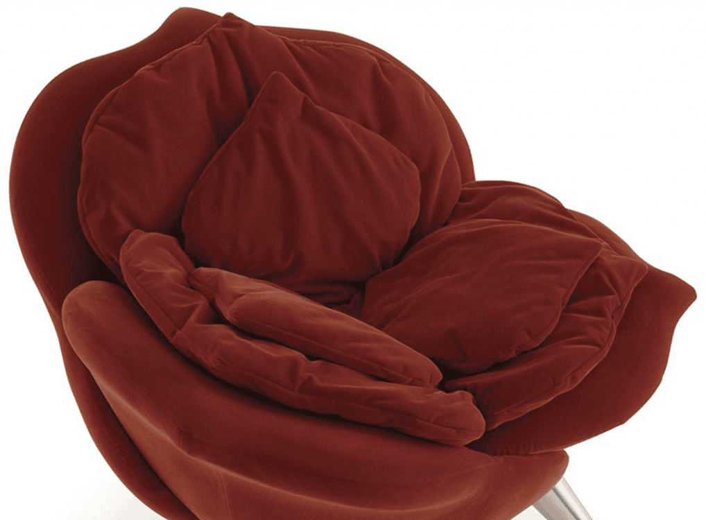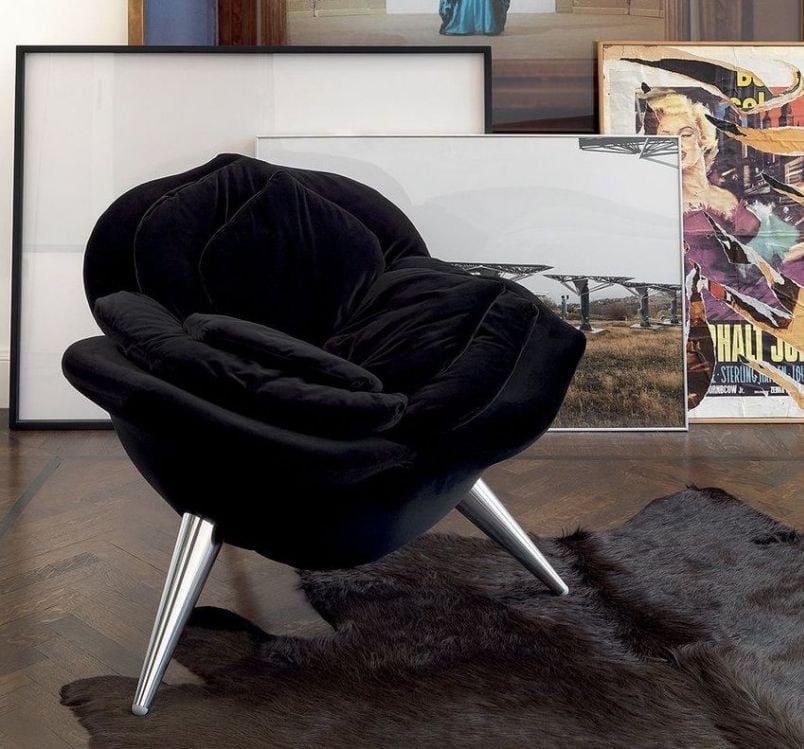 The petals, which form the padding and make the seat welcoming, are made one by one. The frame is in molded metal with small parts in shaped wood. Velvet covers in the collection colors.