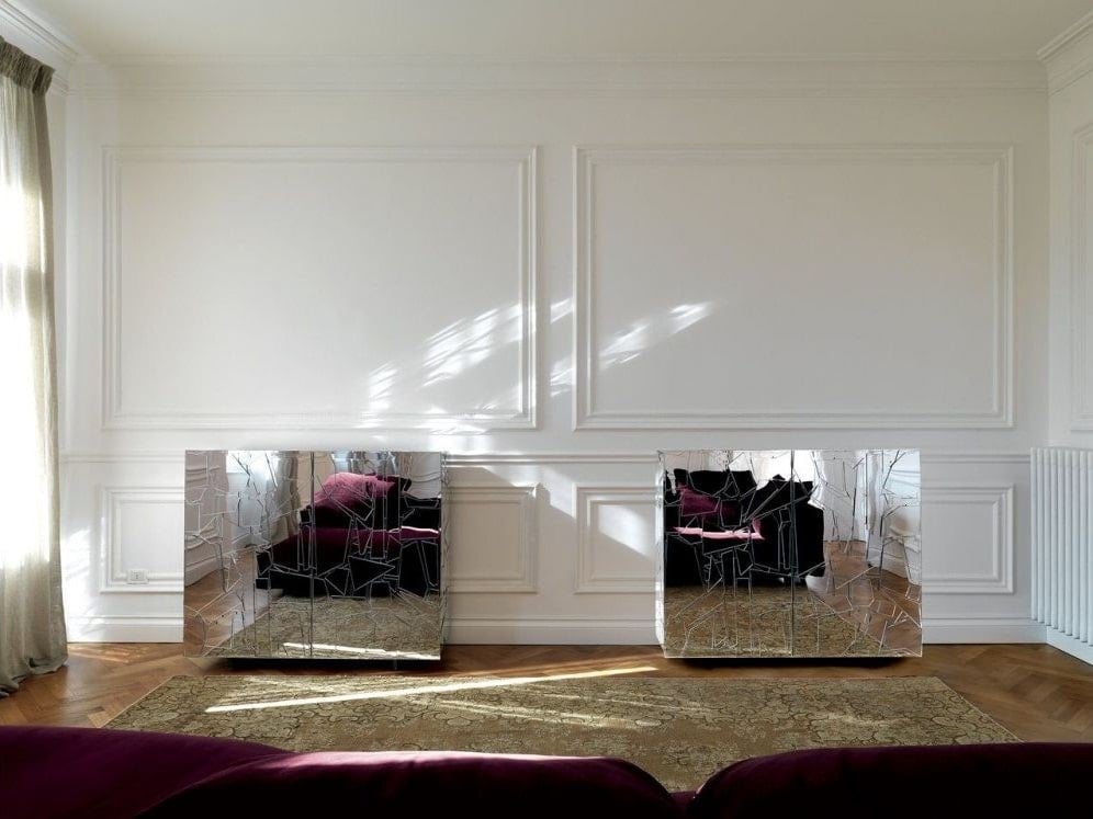 Precious containers of different sizes, tall or short, with doors or drawers. The internal structure is of lacquered wood with special metallic paint of the same color of the exterior coating. The exterior surfaces are a mosaic of mirror shards, unique pieces made by hand.