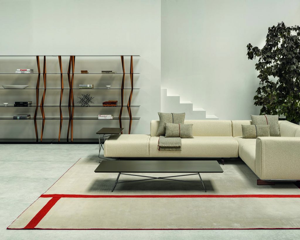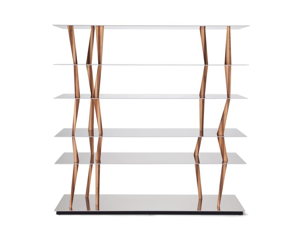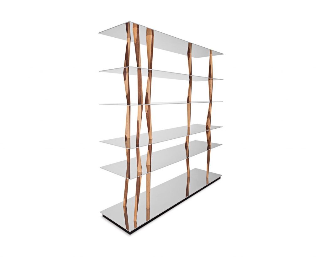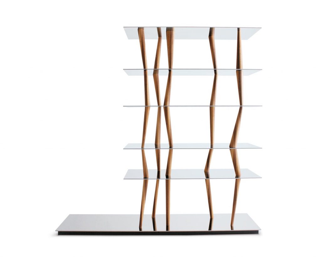 Movement and flexibility summarize the emotional power of Toyo Ito, who in this sculpture-bookcase captures the design essence of Sendais media centre (Japan), which he designed and used as inspiration. This leap in scale consists of six aluminium veneered shelves connected through turned elements of solid wood, all different from each other in inclination and section. Sendai is definitely a piece of furniture of silent albeit captivating design, which reflects the typical oriental philosophy of the great architect.