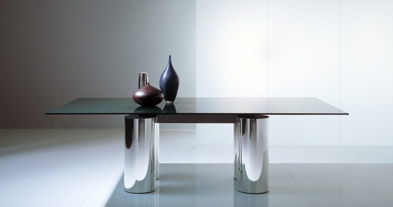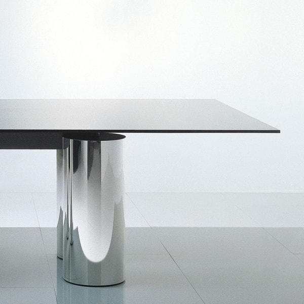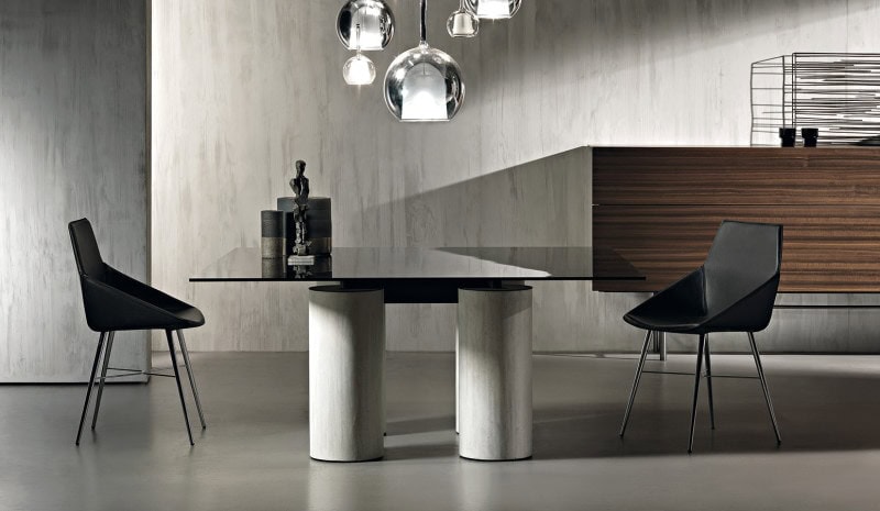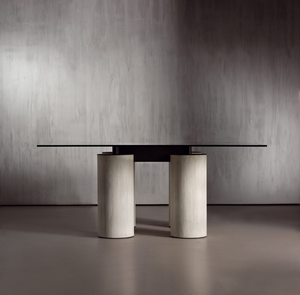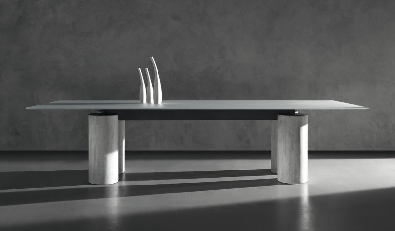 Table with a unique and timeless design in which the apparent thinness and lightness of the glass top contrasts with the considerable diameter of the columns. These columns acquire greater expressive force from the different colours and textures of the cladding materials: the shine of the stainless steel and the concrete craftsmanship of the Fresco finish, made manually by mixing cement paste, inert materials such as sand, marble dust, earths and special resins that allow processing "fresco on fresco" same as frescos and able to show stripes, spots, variegation, slight holes: all these are marks of the artist's hand and exalt the beauty of always different finishes, never repetitive.