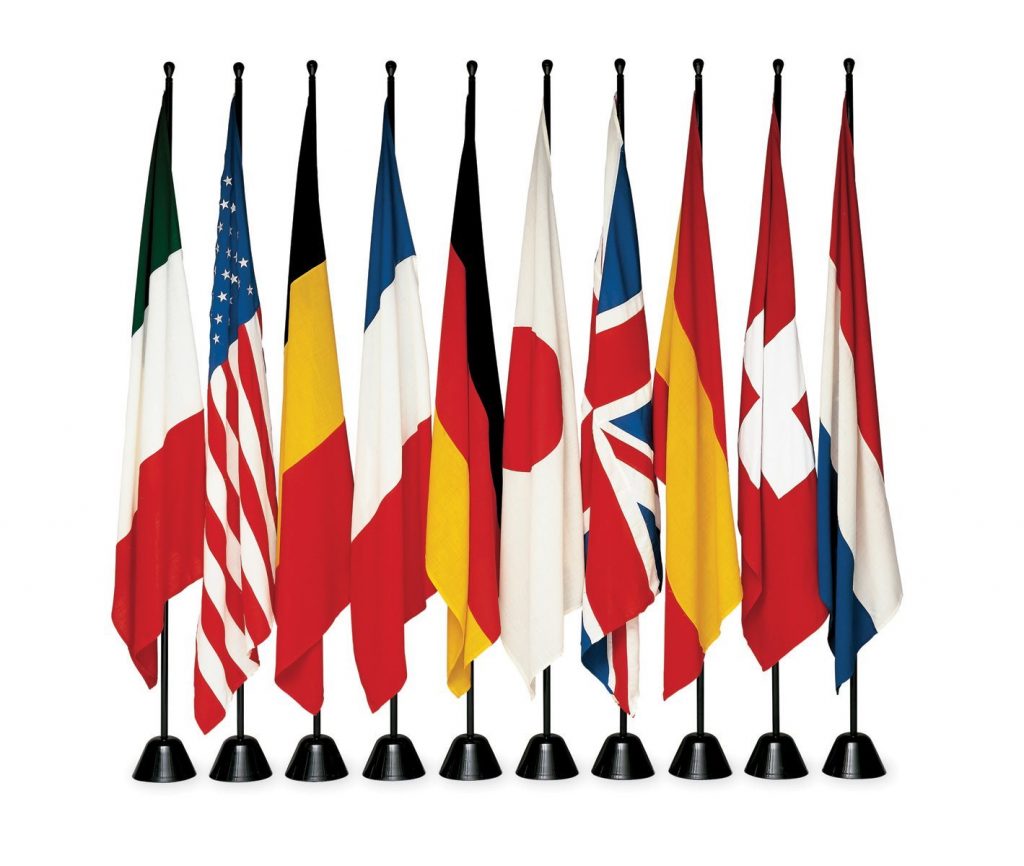 Base in black painted polypropylene. Steel support rod, in the shade black for outdoors. Bunting flag. Regulation colours, symbols and sizes. Flag size cm 100 x 150, Swiss flag cm 100 x 100. On the USA and Council of Europe flags, the symbols are embroidered. Base and support rod, without cloth, are available separately