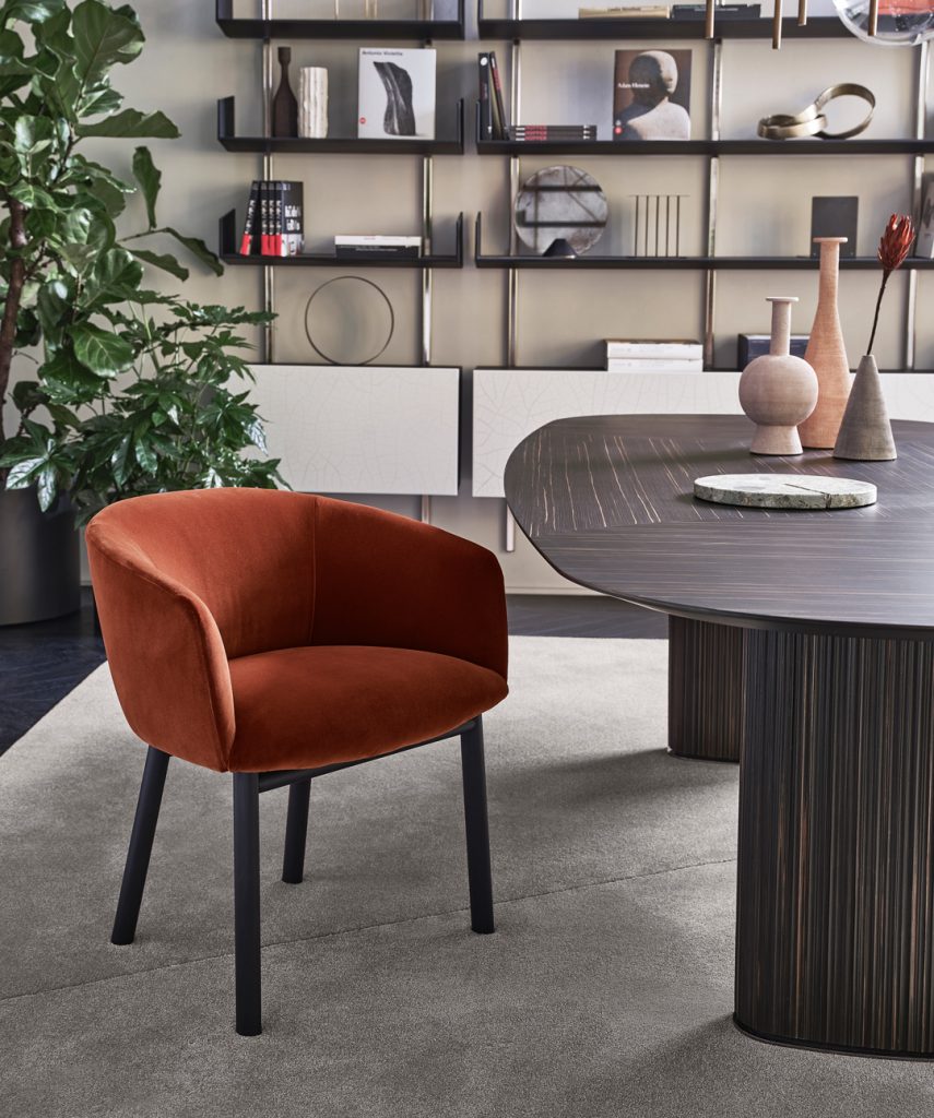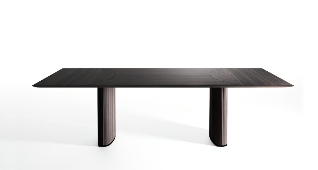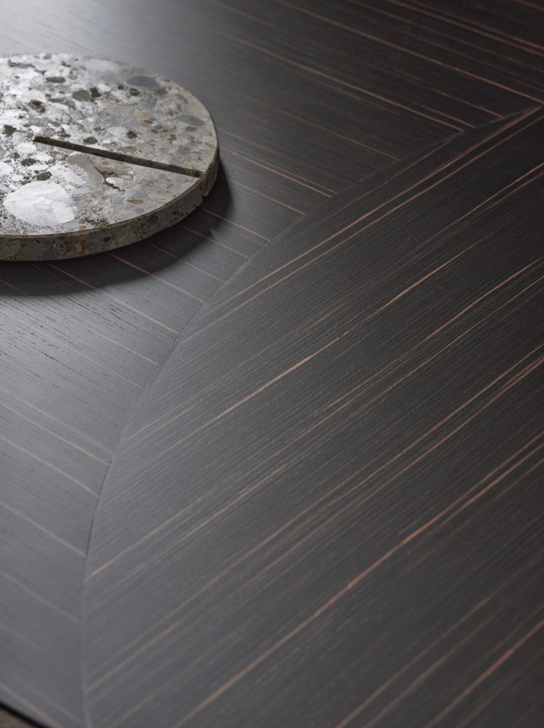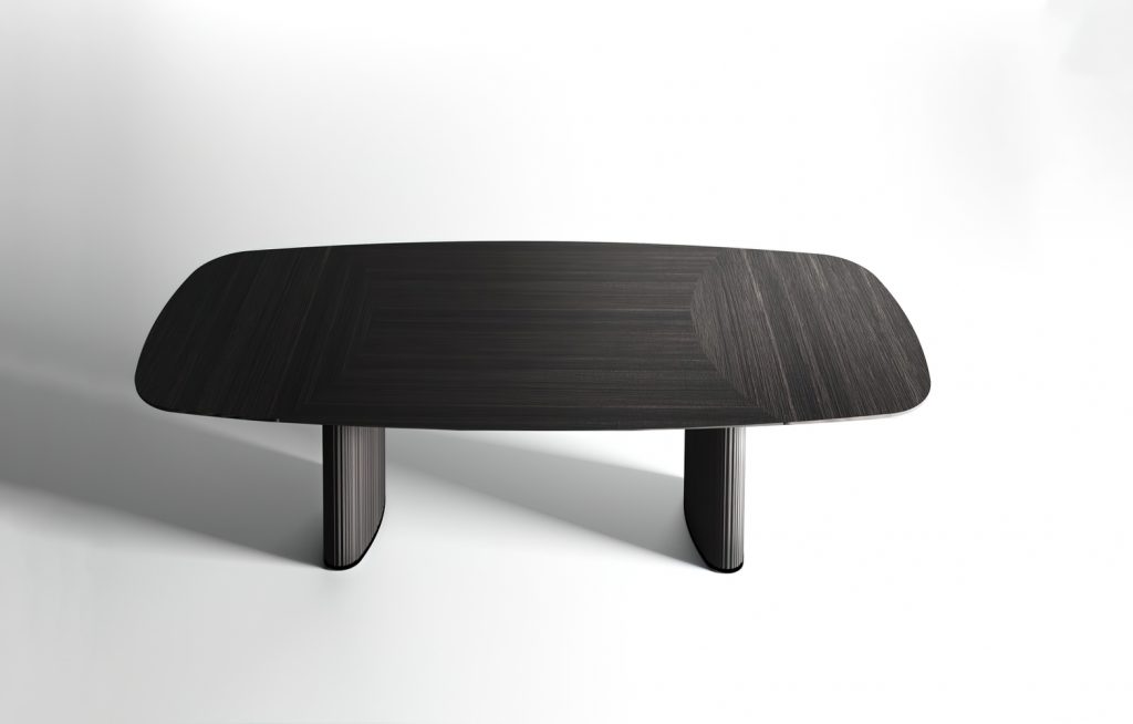 Table with inlaid wooden top in the finish Ebano Capri. Also available with natural polished Calacatta Vagli Oro marble, Bianco Carrara or Verde Alpi. Ovalized bases covered by solid milled wood in the finish Ebano Capri and black chromed metal details.