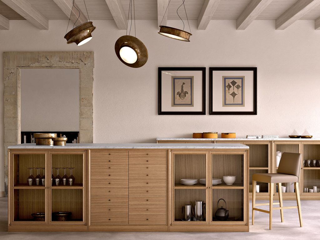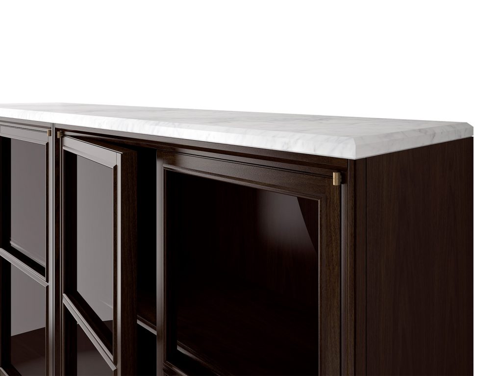 Sideboard in solid american walnut and veneered plywood, 4mm transparent glass doors, hardware in burnished brass, 1 internal wooden shelf. (Top excluded). Magnet or cremone bolt closure.