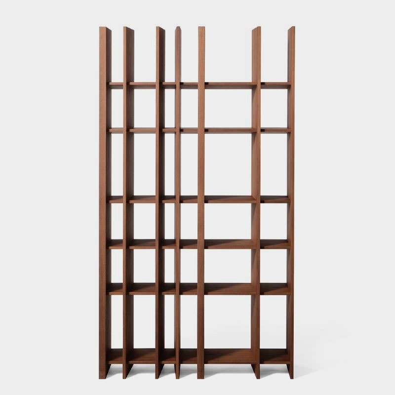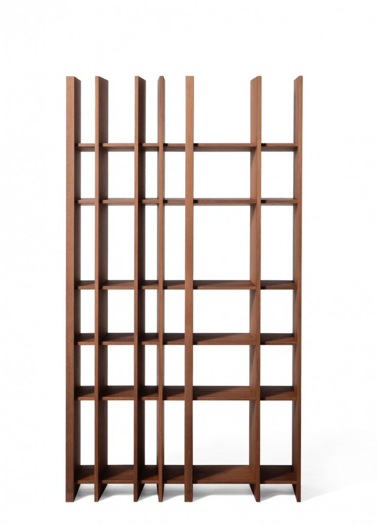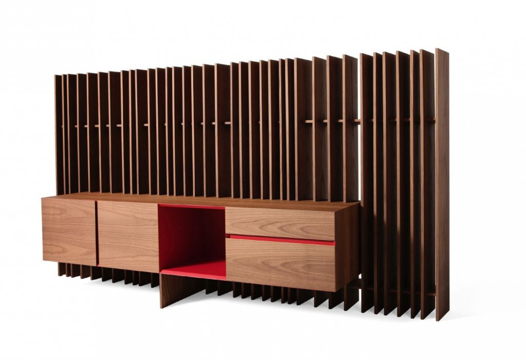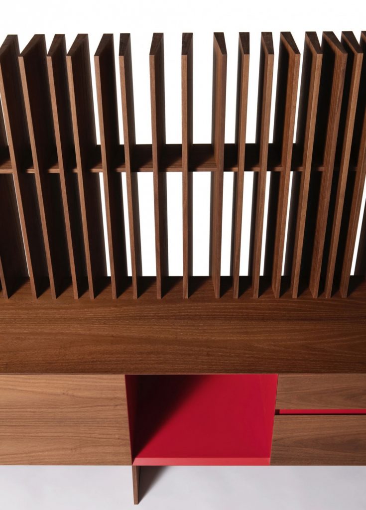 Dividing/bookcase element made of vertical struts with different angles. Made of veneered multilayer wood. The Sipario LC version is characterized by having a suspended storage unit equipped with hinged doors, drawers and with an open space with 45 degrees angle joints profile. The composition is free-standing. Upon request, the inner part of the sideboard can have mat lacquered finish, in the RAL colours of the collection. The Sipario system includes the elements Sipario L, which can be placed side by side.
