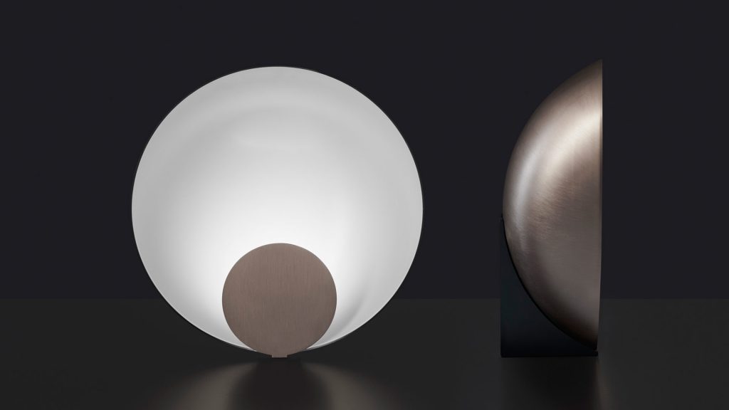 Marta Perla has designed Siro, a semi-spherical table lamp with a disc at the front releasing in its interior an oblique light thanks to the slim LED light source. Seen from the front, Siro appears to consist of two two dimensional elements, giving the illusion of being perfectly balanced on a surface.