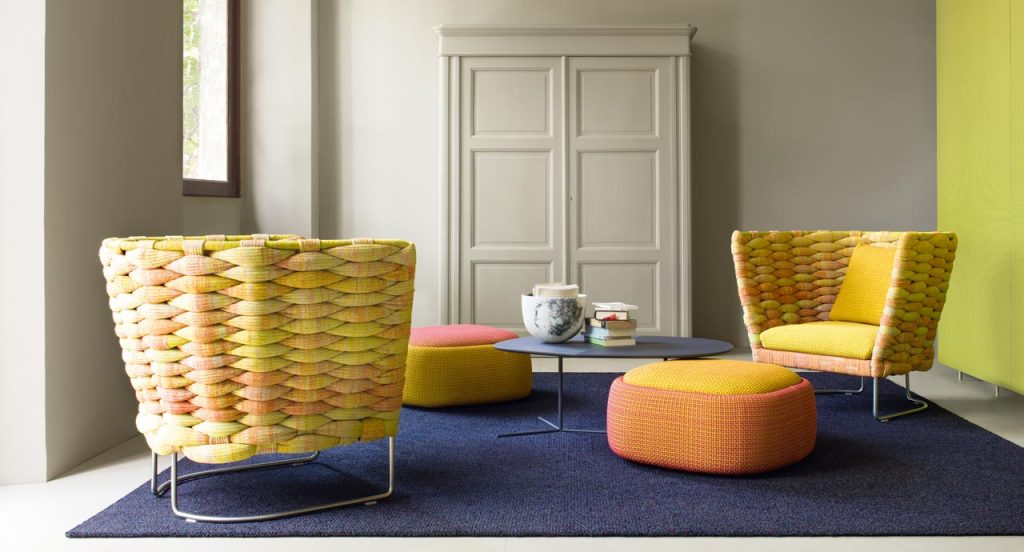 Pouf-container. The Smile series also includes an armchair and a two-seats sofa. - Base: molded in plastic material. - Padding: stress resistant expanded polyurethane. - Upholstery: removable and available in a selection of fabrics in the collection. The upholstery is also available in a combination of Blend and Dots fabrics - Awards: Smile won the MIAW, Muuuz International Design Awards 2014 as one of the most innovative product in 2013.