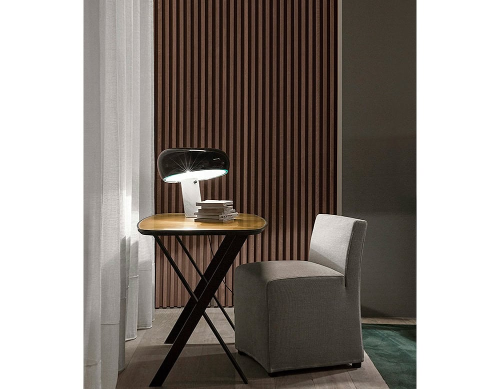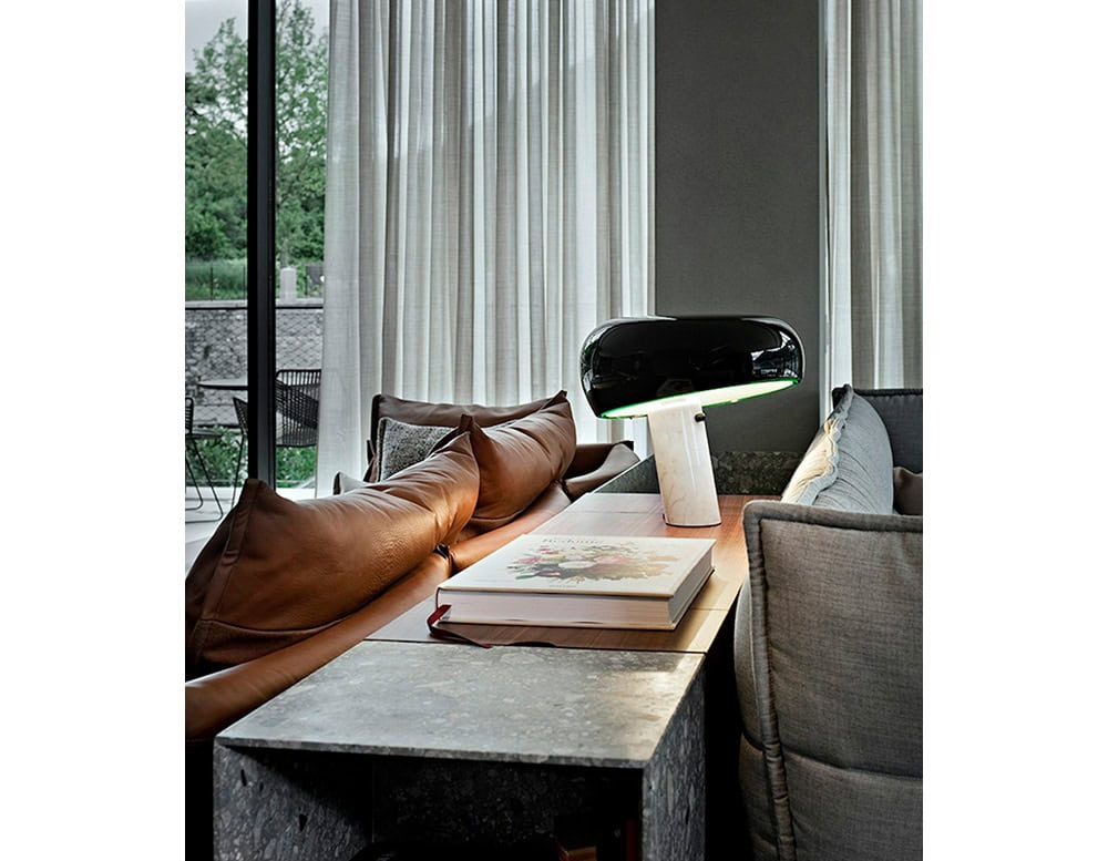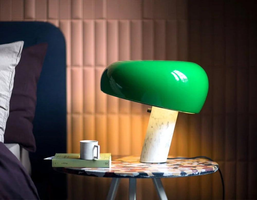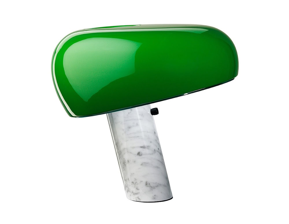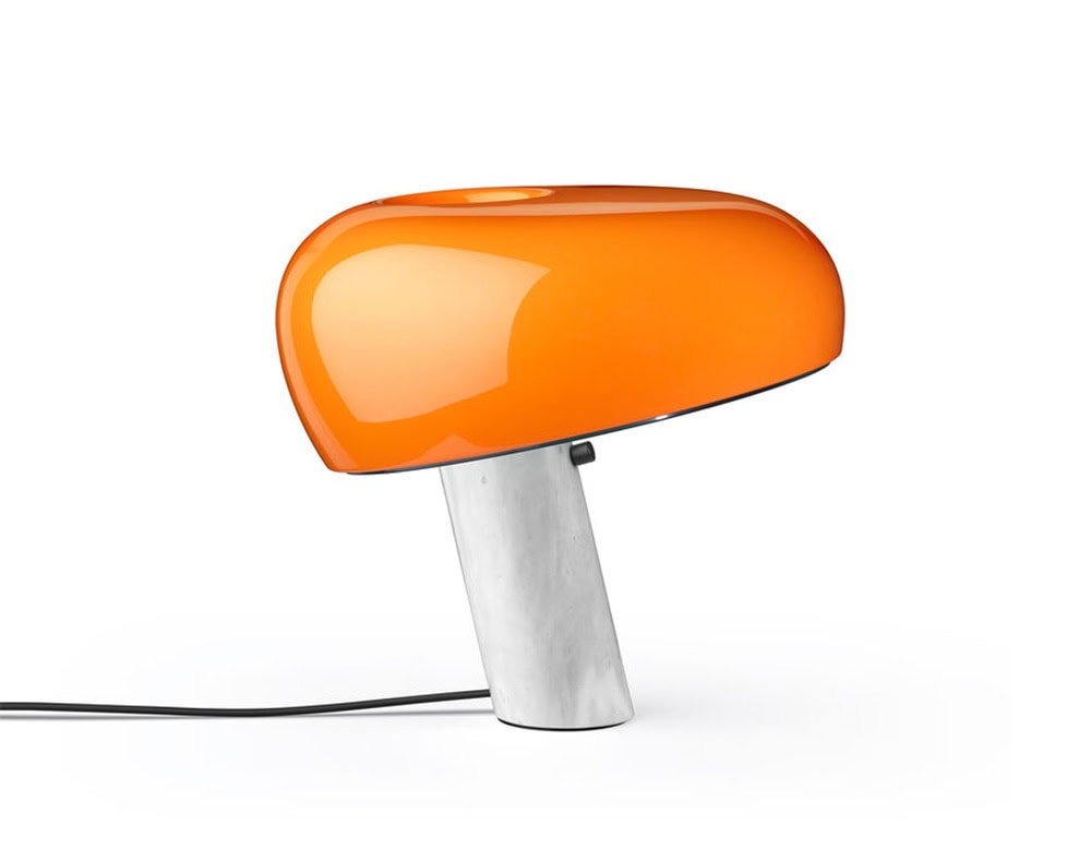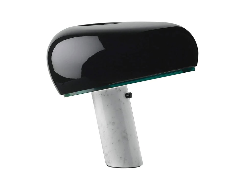 The Snoopy lamp, named after the beloved character created by Charles M. Schulz, offers direct light through a thick glass disk and an enameled reflector, elegantly balanced on a white marble base, complete with a dimmer and switch. Originally launched in 1967, this version was updated and reintroduced in 2003 with modern technology.