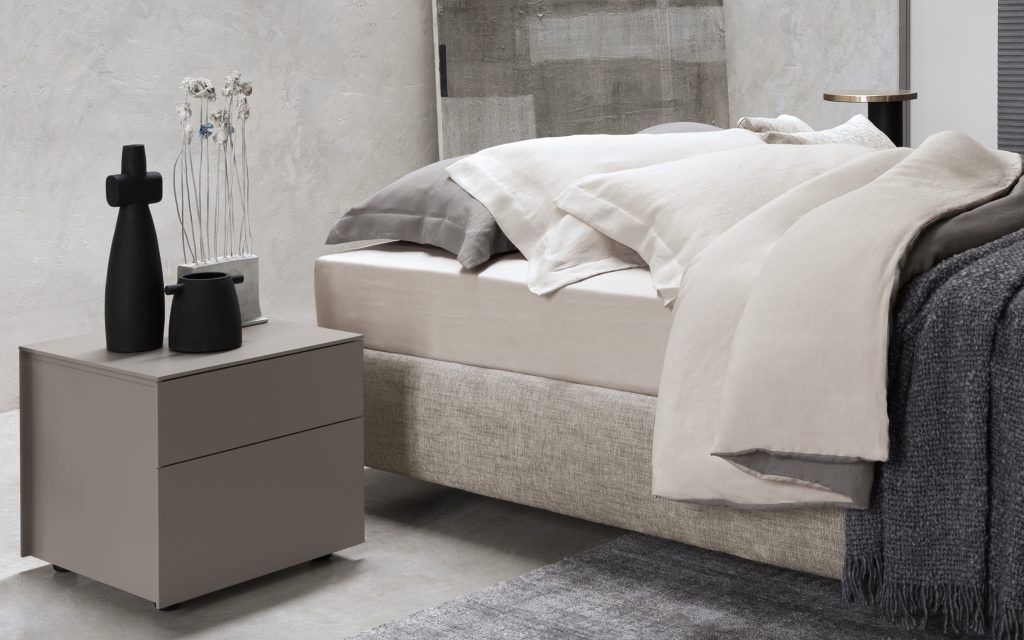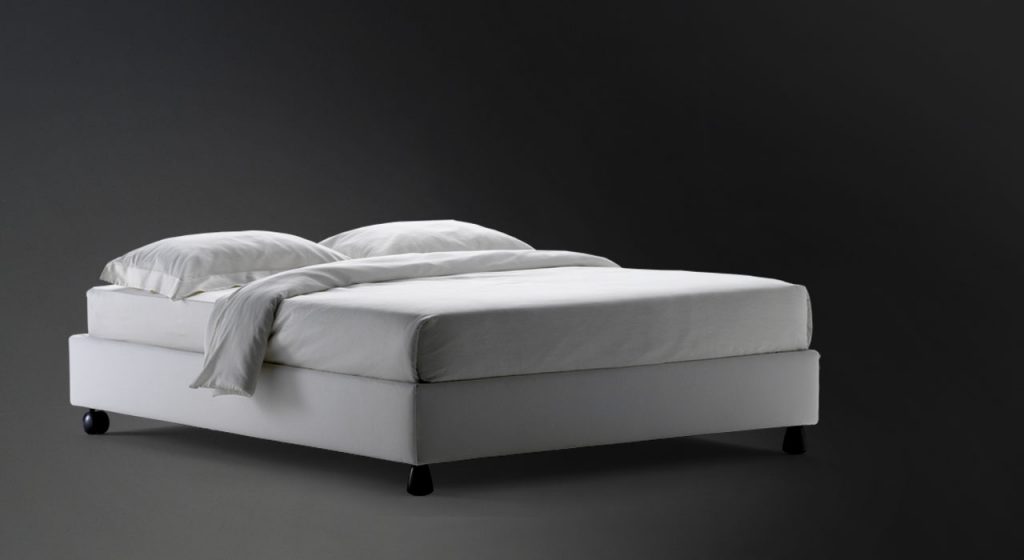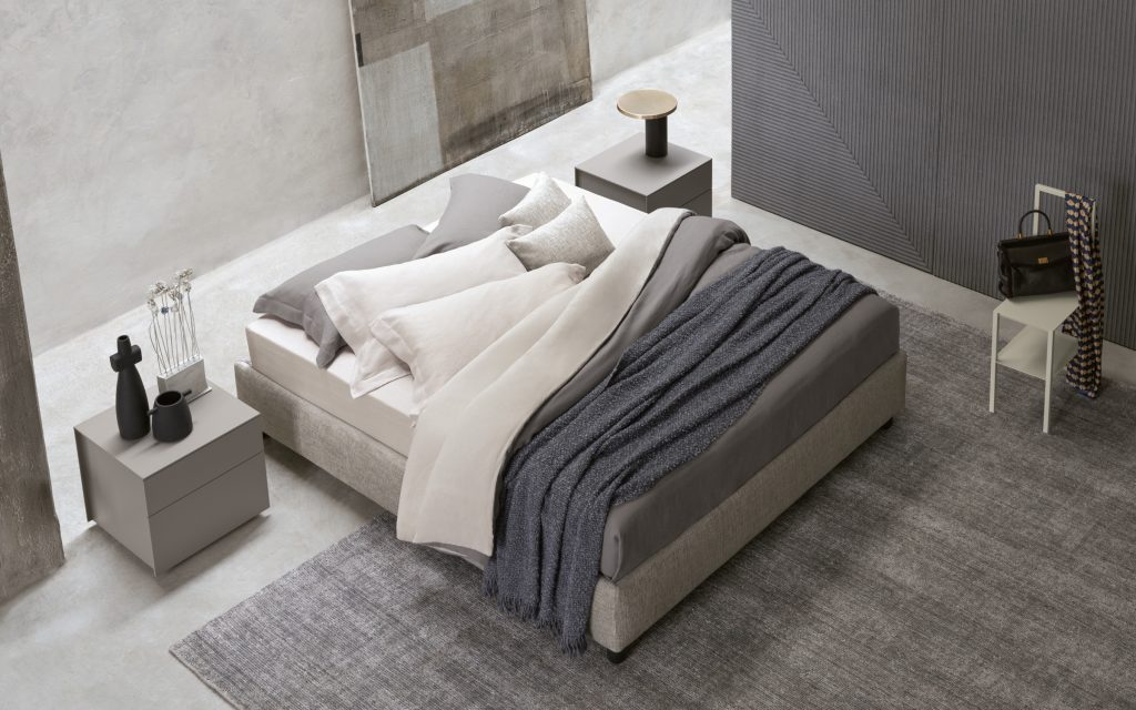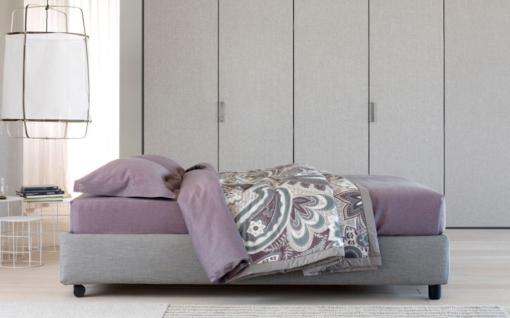 Extremely functional bed of elegant linear design. Available with box-spring base Leonardo, storage base, fixed base h 25 cm or h 16 cm and with electrical movements. Completely removable cover in fabric, leather or Ecopelle.