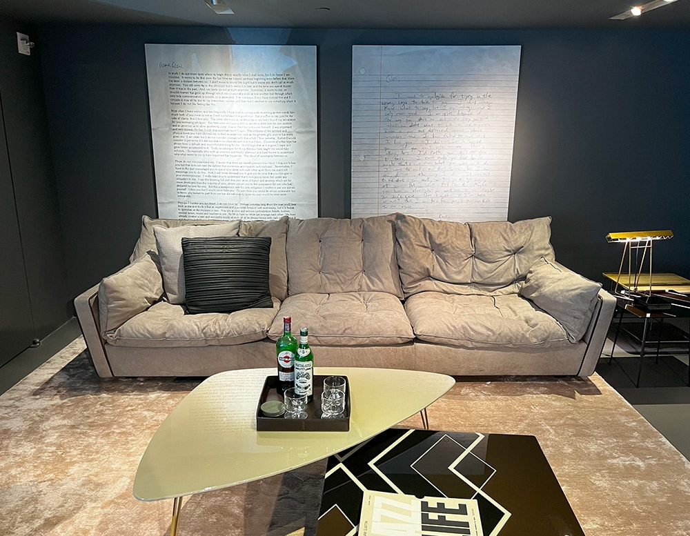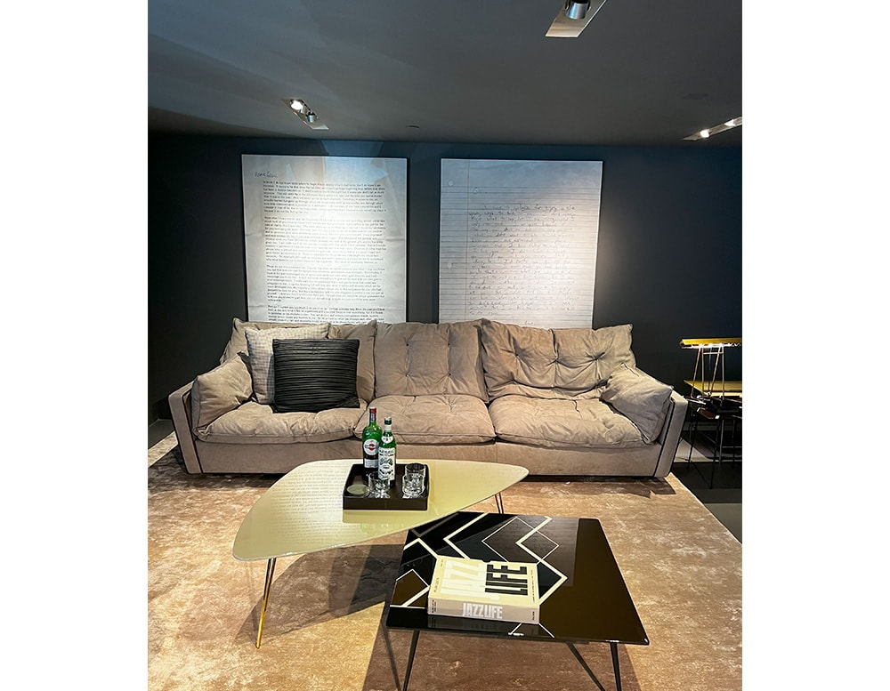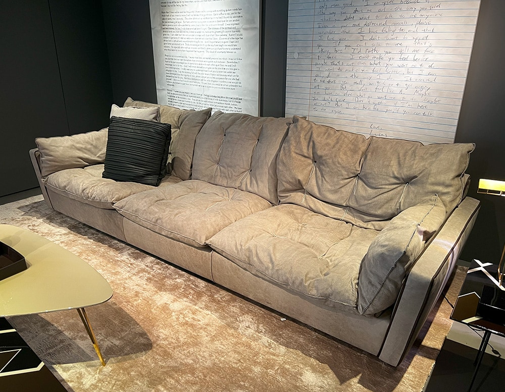 The sofa recalls classic shapes embracing like a nest, a cradle or a shelter. Fluffy overflowing pillows lean over a solid and rigorous structure. They are paunchy like clouds, characterized by small leather details that remind the mattresses stitching.