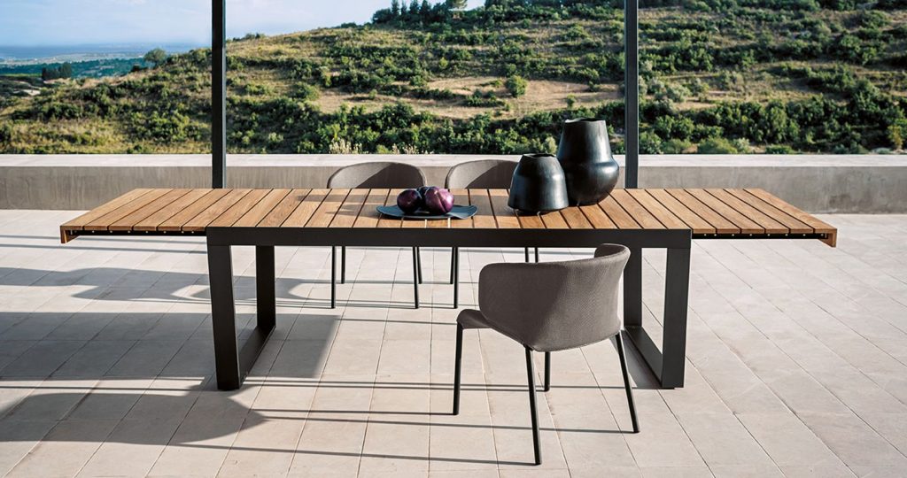 The exclusive extending outdoor table SPINNAKER draws its expressive power from a severe and extremely modern design, which simultaneously highlights the solidity of the material and the lightness of the top.