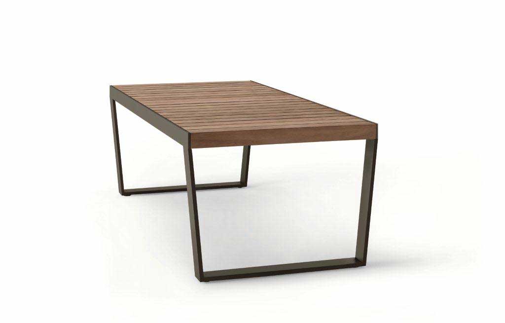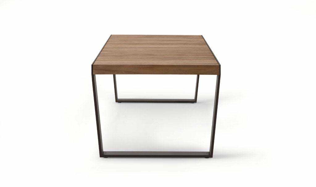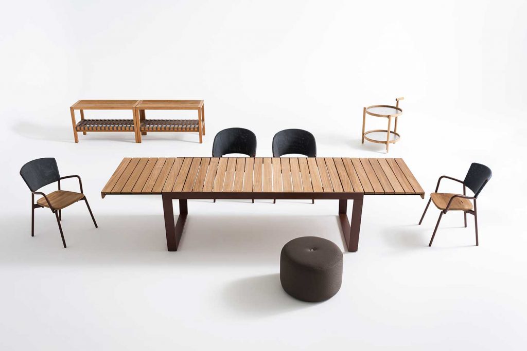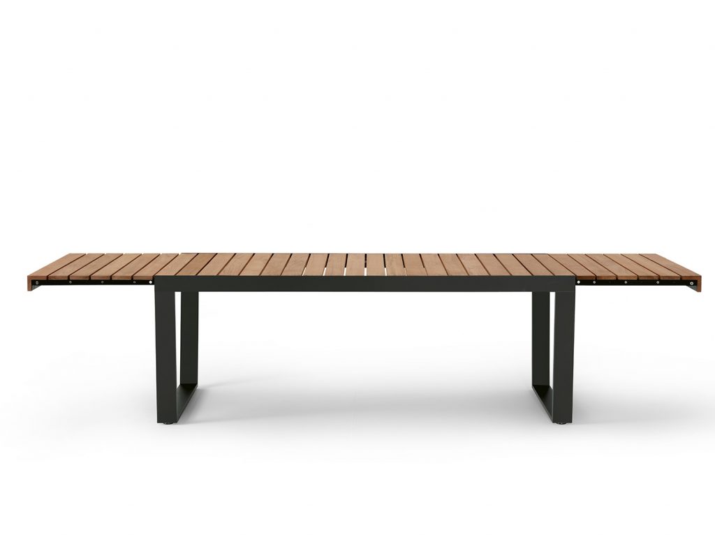 The extension system is characterised by a tip-up opening mechanism that can be activated running the top along the guides. SPINNAKER has a solid teak slats top and geometric, continuous metal painted legs for outdoor use.Length 209/335cm - 82"1/4 / 131"7/8