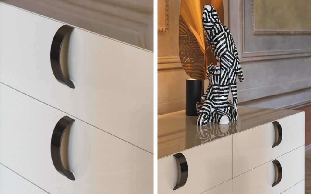 Elegant series in glossy cream lacquered finish consisting of chest of drawers, tallboy and bedside table. The handles are available in dipped gold or black nickel.