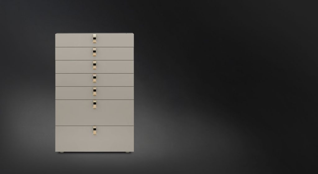 Elegant series in glossy cream or matt greige lacquered finish consisting of chest of drawers, tallboy and bedside table. The handles are available in dipped gold, black nickel or matt burnished.