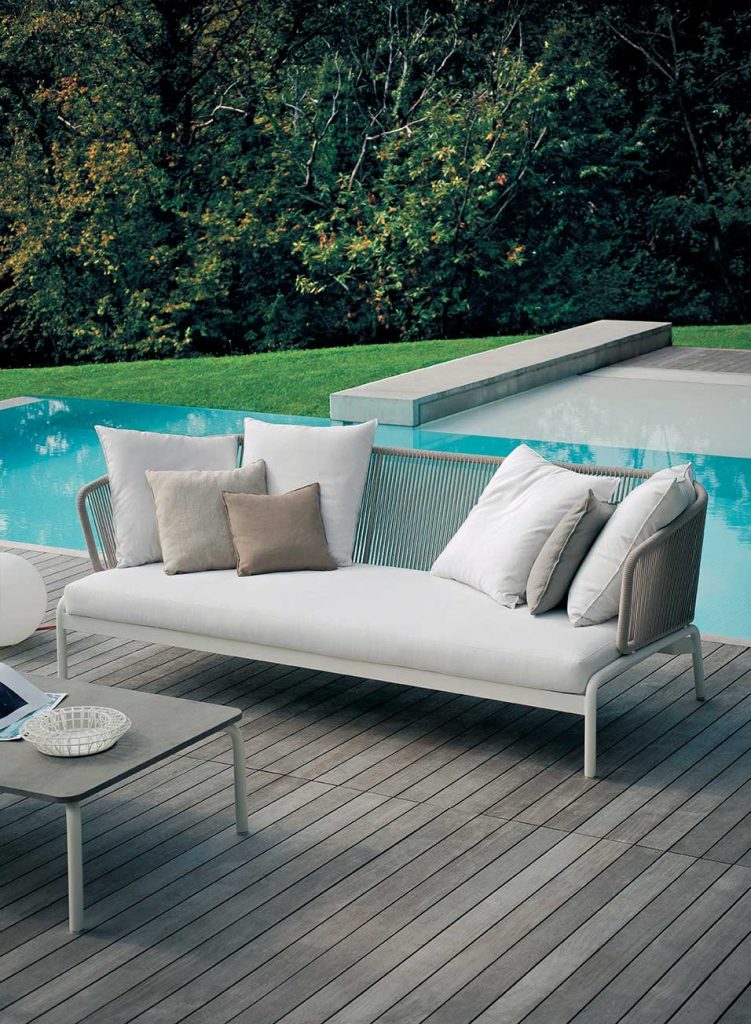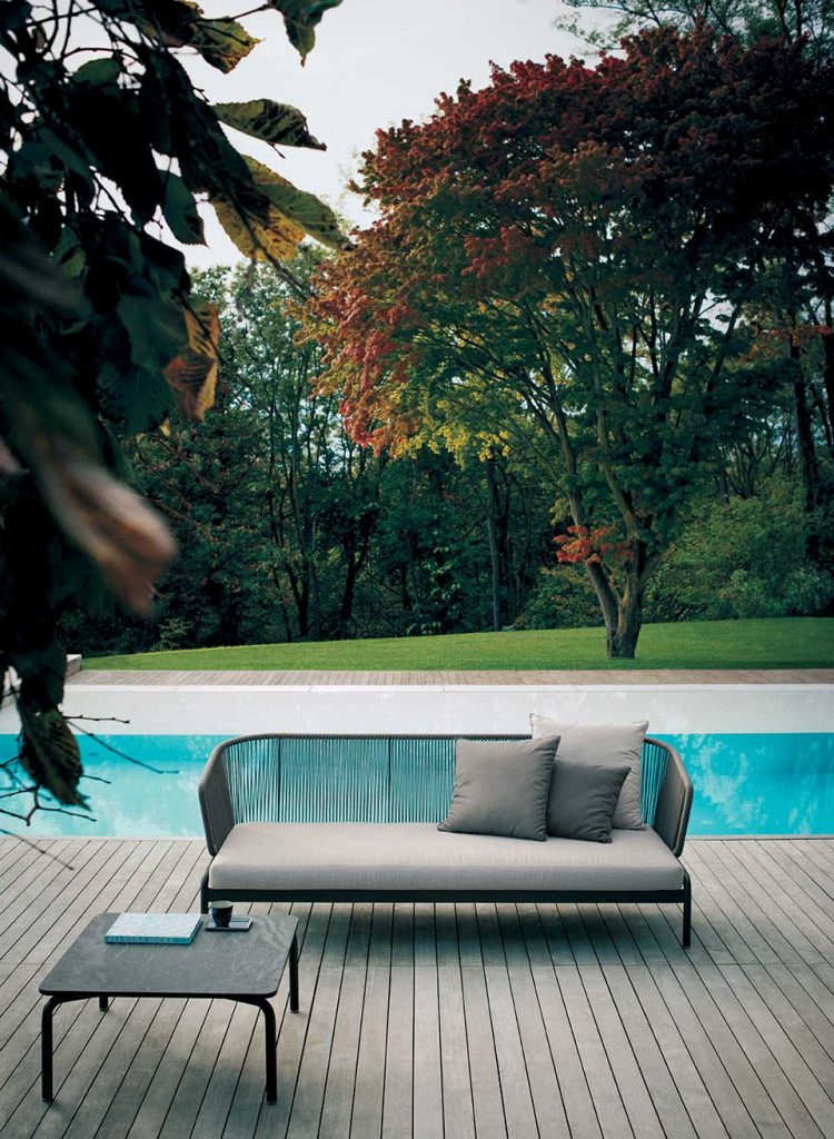 A closely spaced succession of cords, embraced to a metallic tubular frame, with simple, sinuous lines that brings to mind weaving spools.The result is a collection with an explosive design, a perfect balance between strength and lightness, that doesnt neglect of comfort of seating, that can accommodate an abundance of soft cushions.