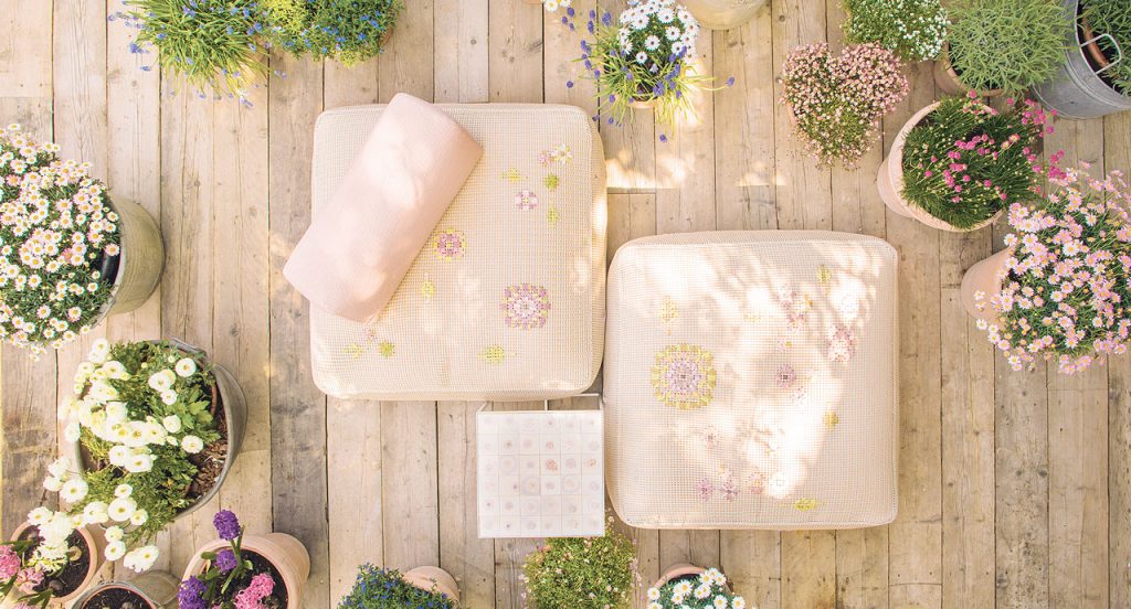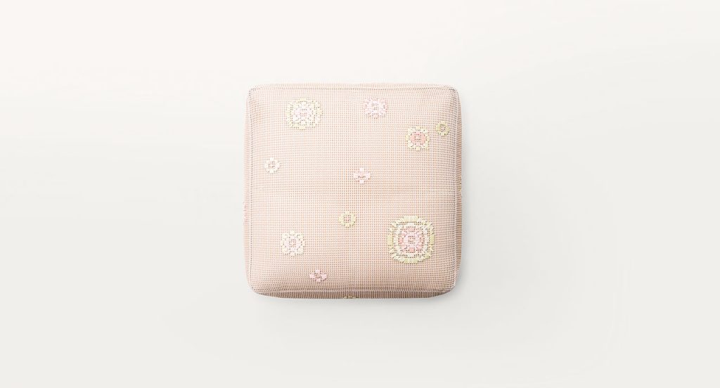 Series of poufs with removable cover available in different dimensions. - Structure: polystyrene spheres encased in a three-dimensional polyester covering. Insert in expanded polyurethane covered with water repellent polyester fabric. - Upholstery cover: Kimia fabric hand embroidered with flat cords in Rope yarn. - Notes: the pouf item B149DE can be completed by a backrest to be positioned as desired, made of expanded polyurethane with base provided with ballast (backrest of the Orlando series). The floral embroideries on Kimia fabric are hand made according to pre-established designs. An additional foam covering in Luz fabric, in a colour matching the upholstery fabric, is always added to the three-dimentional polyester covering. We advise to use a Winter Set protection cover.