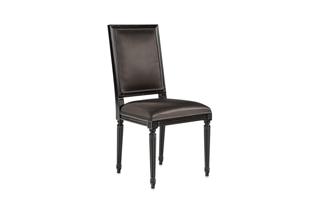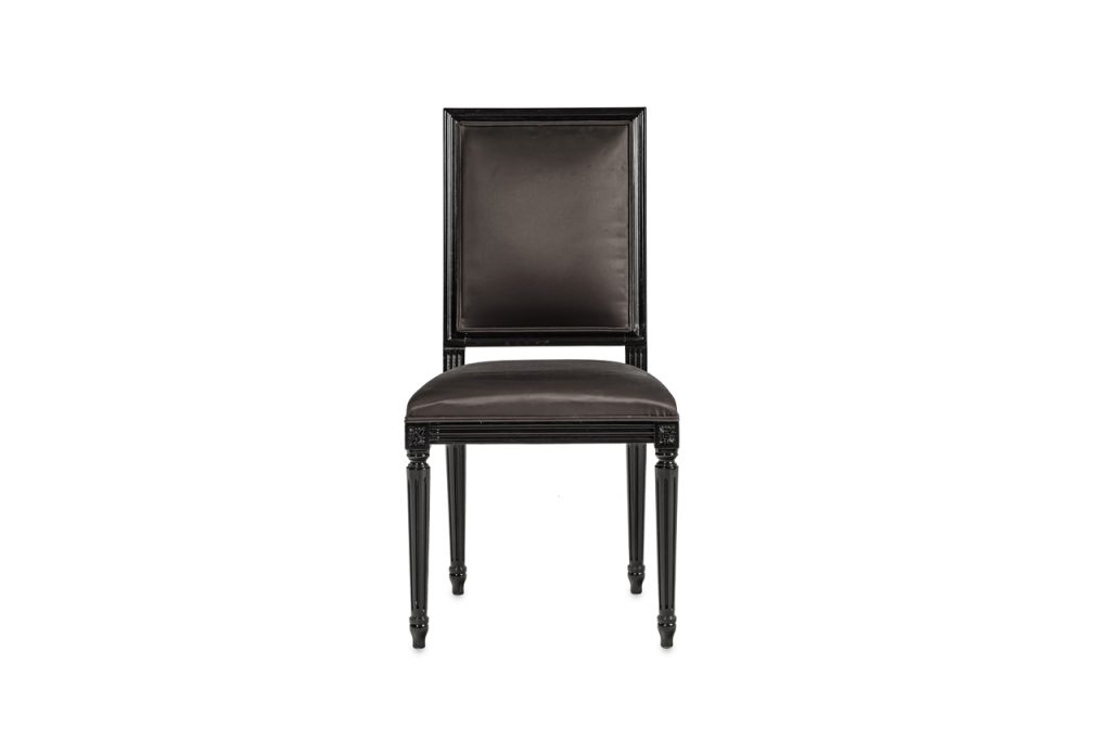 Set of four high back dining chairs - Dining chairs feature a black wooden structure - Ral#8022. The seat back and cushion are upholstered in a black fabric.