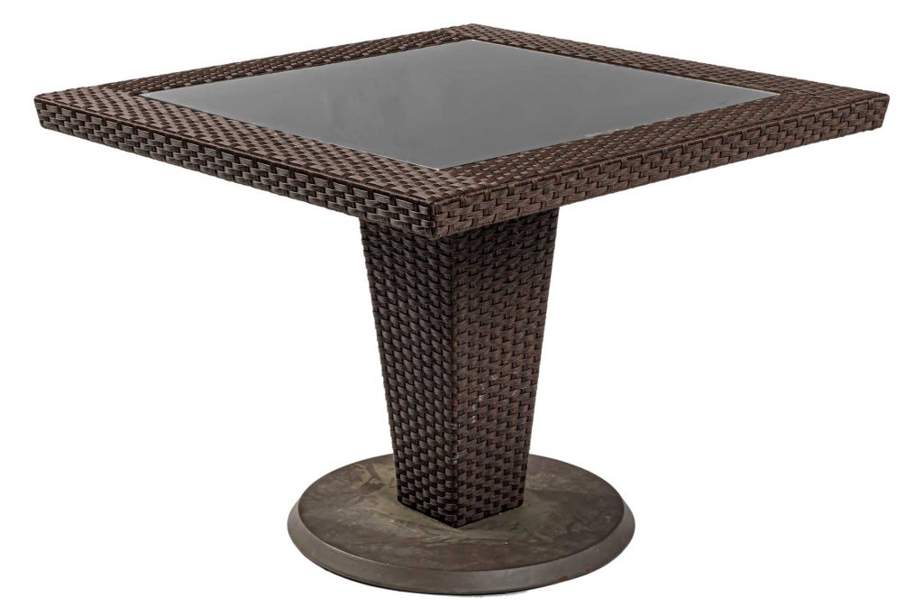 An outdoor dining table made from dark brown sun weave rattan, woven directly to the structure. Table top features a glass top insert.