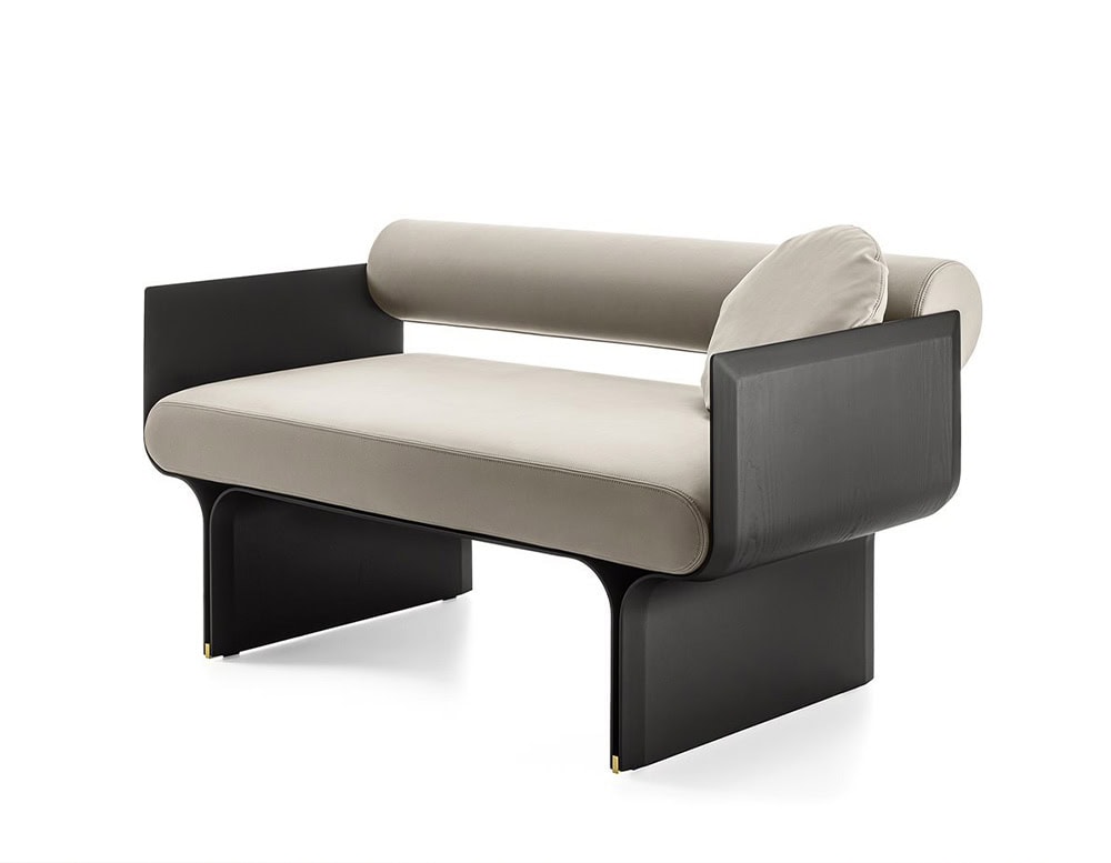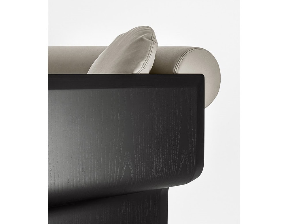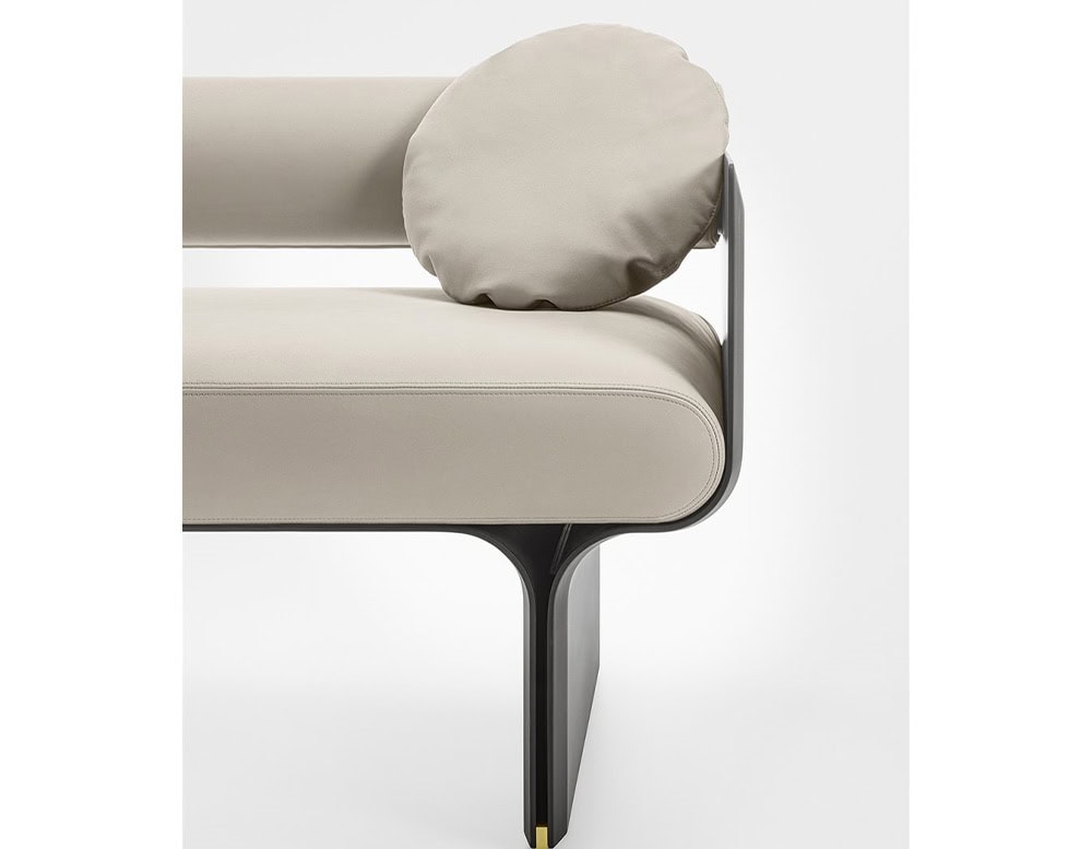 Small sofa with curved black open pore stained ash base and bright brass details. Also available opaque lacquered wooden version in the colours “Rosso Persia”, “Grigio Londra”, “Nero Giza”, "Bianco Camargue", "Verde Provenza", "Blu Pacifico", "Bordeaux Etruria", "Rosa Jaipur" and "Sabbia del Nilo". Padding in polyurethane foam covered by fabric or leather as per samples. Removable cover. Two diam. 38 cm downpadding cushion covered in the same finish of the armchair included. Additional stitching is required for elements with leather upholstery compared to elements with fabric upholstery.