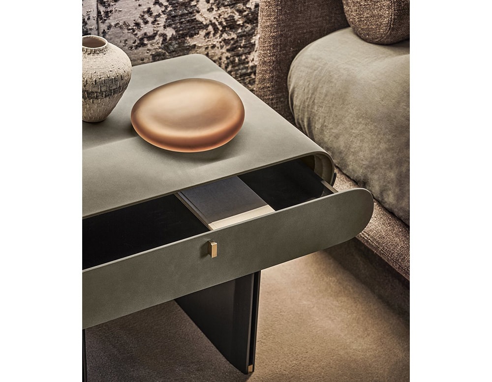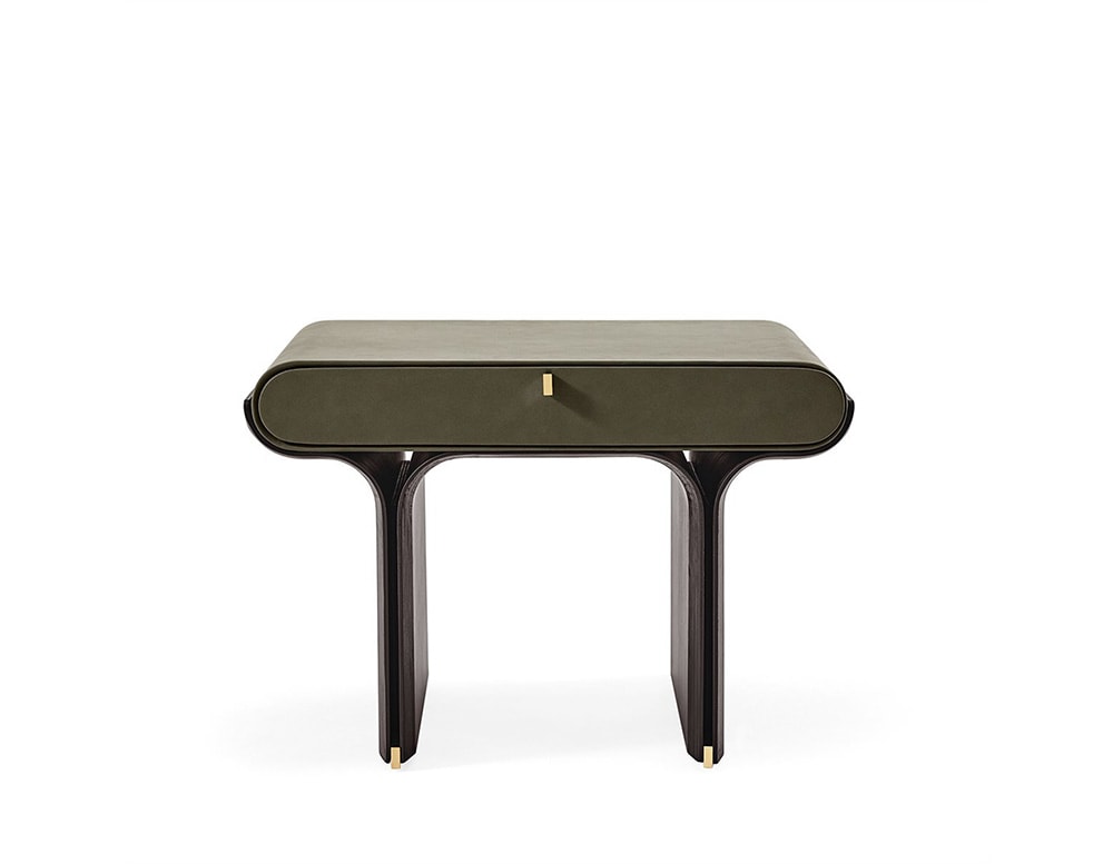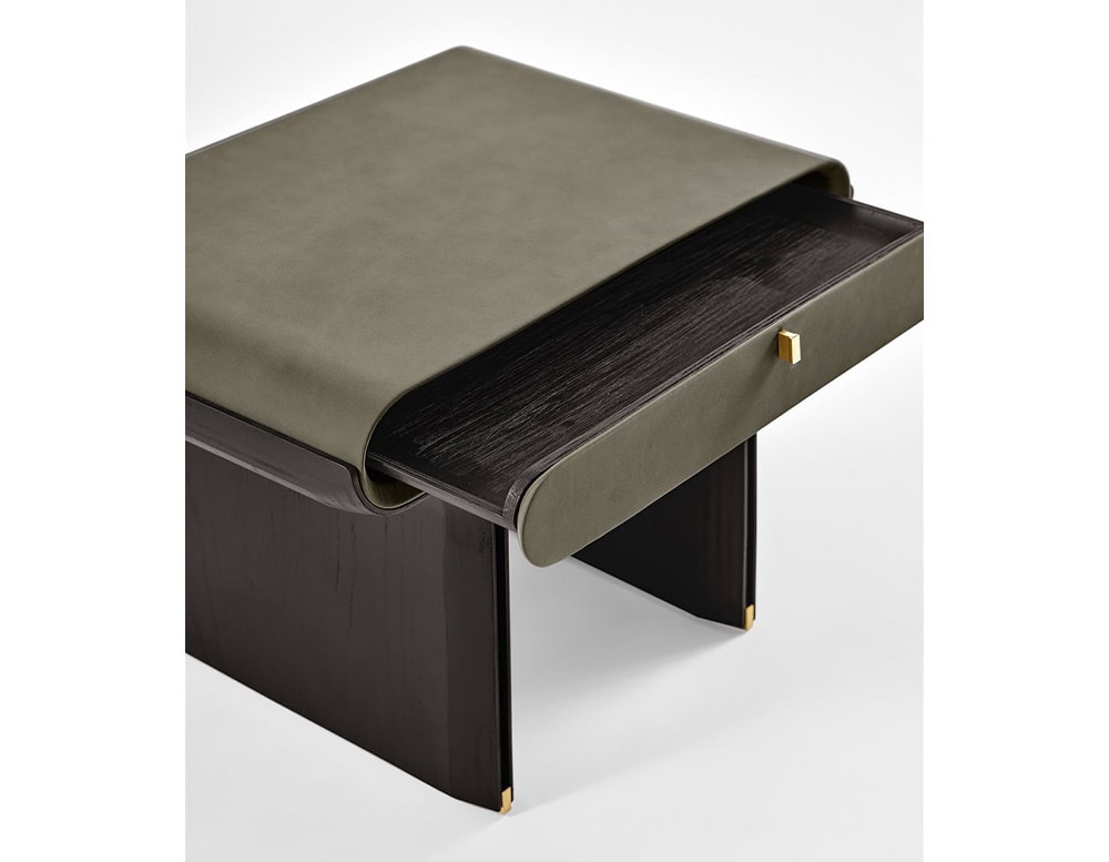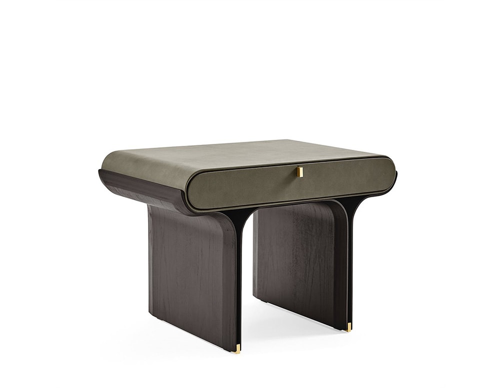 Bedside with drawer with curved black open pore stained ash base and bright brass details. Wooden structure covered by leather or suede as per samples.