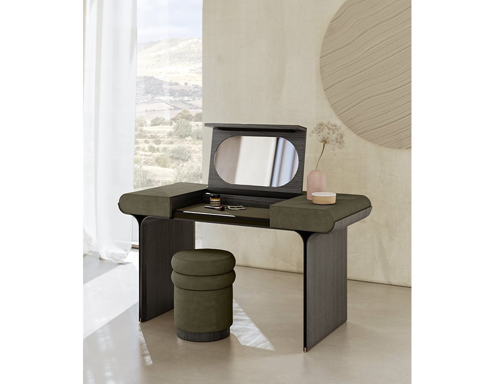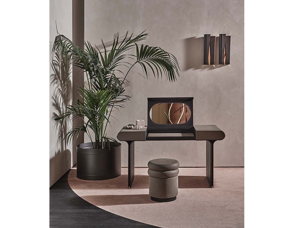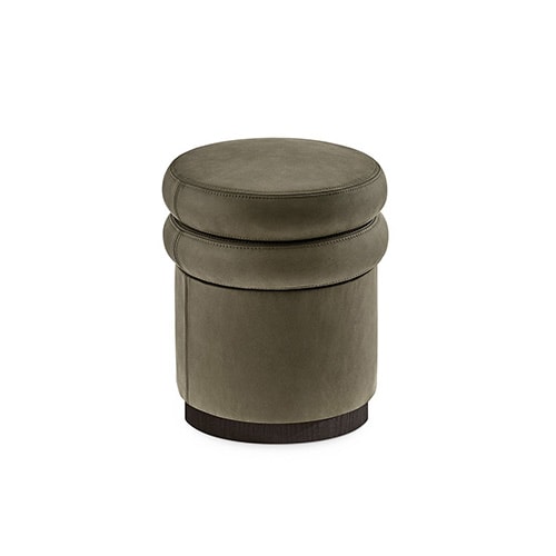 Pouffe with inside structure in wood and by-products padded in non-deformable foam polyurethane in different density and polyester fibre. Black open pore stained solid ash base. Covered by fabric or leather as per samples. Not removable cover. Additional stitching is required for elements with leather upholstery compared to elements with fabric upholstery.