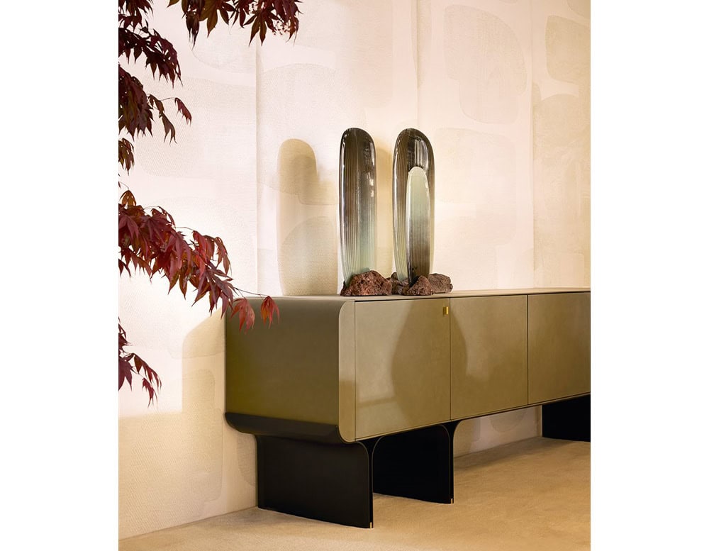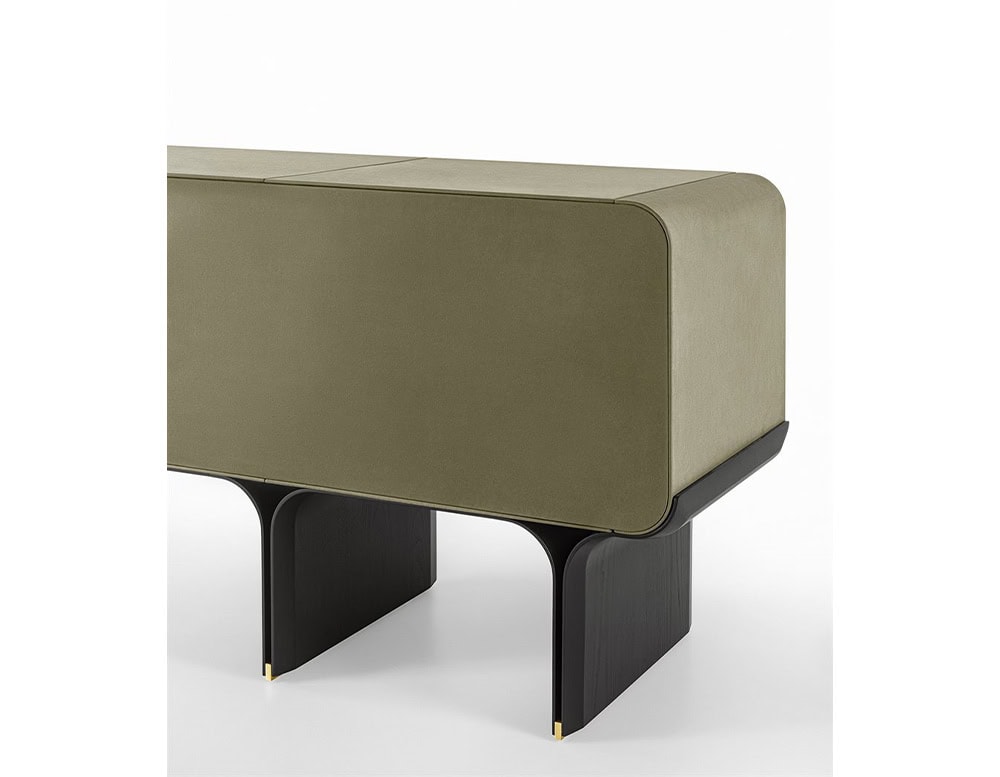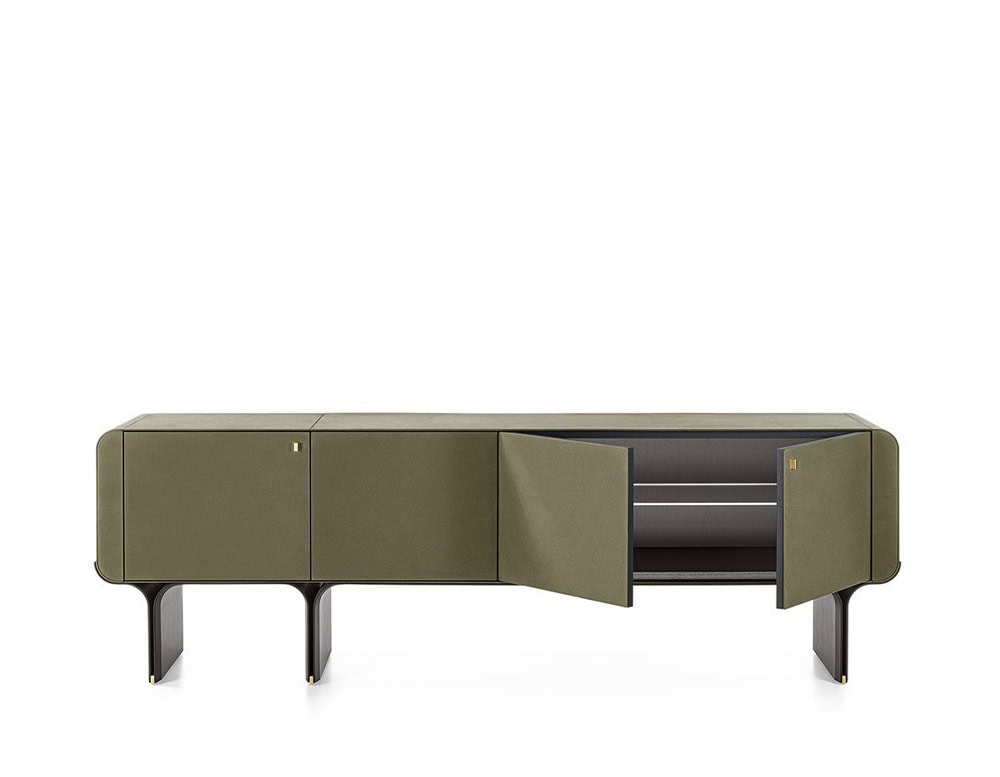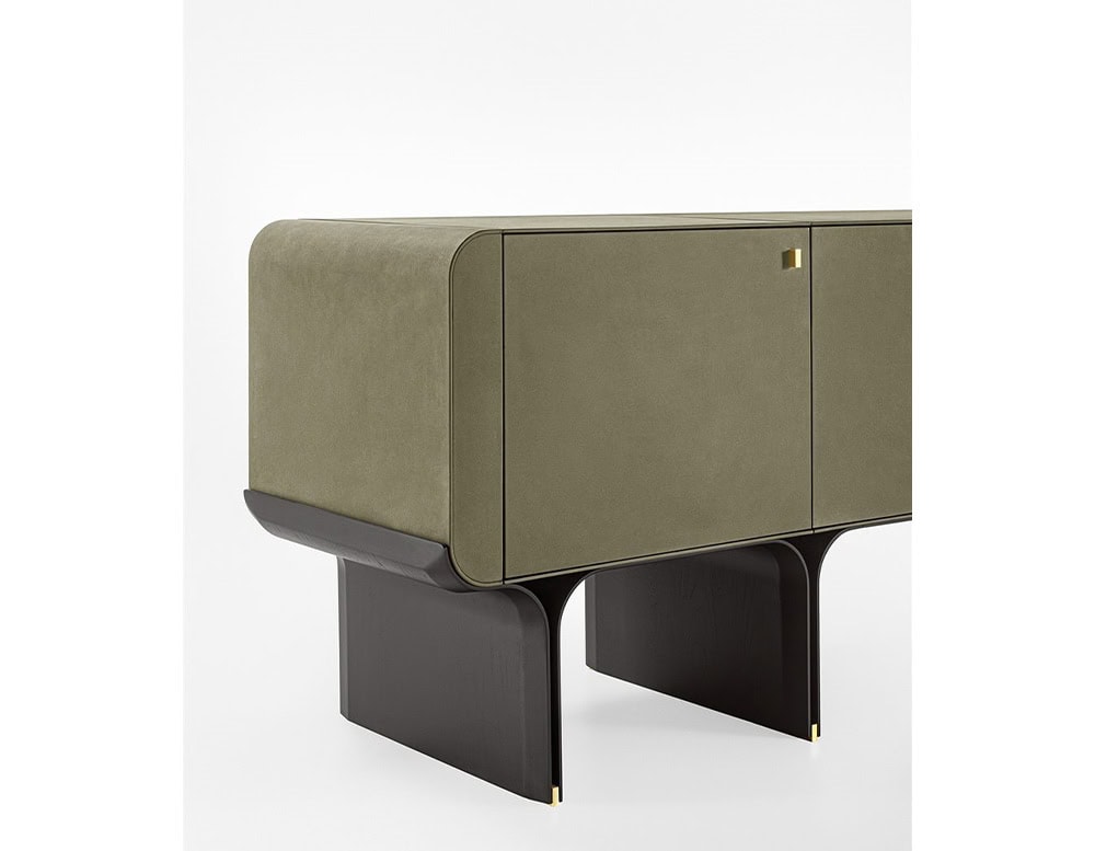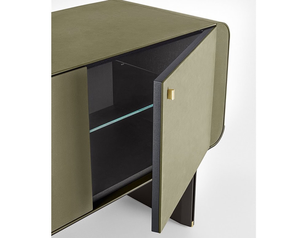 Sideboard with curved black open pore stained ash base and bright brass details. Wooden unit covered by leather fard as per samples. Supplied with 10mm extralight inside glass shelf. Additional stitching is required for elements with leather upholstery.